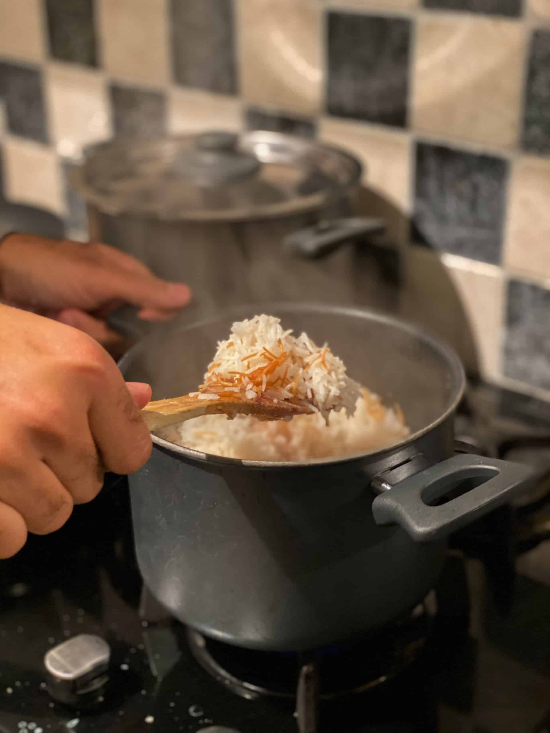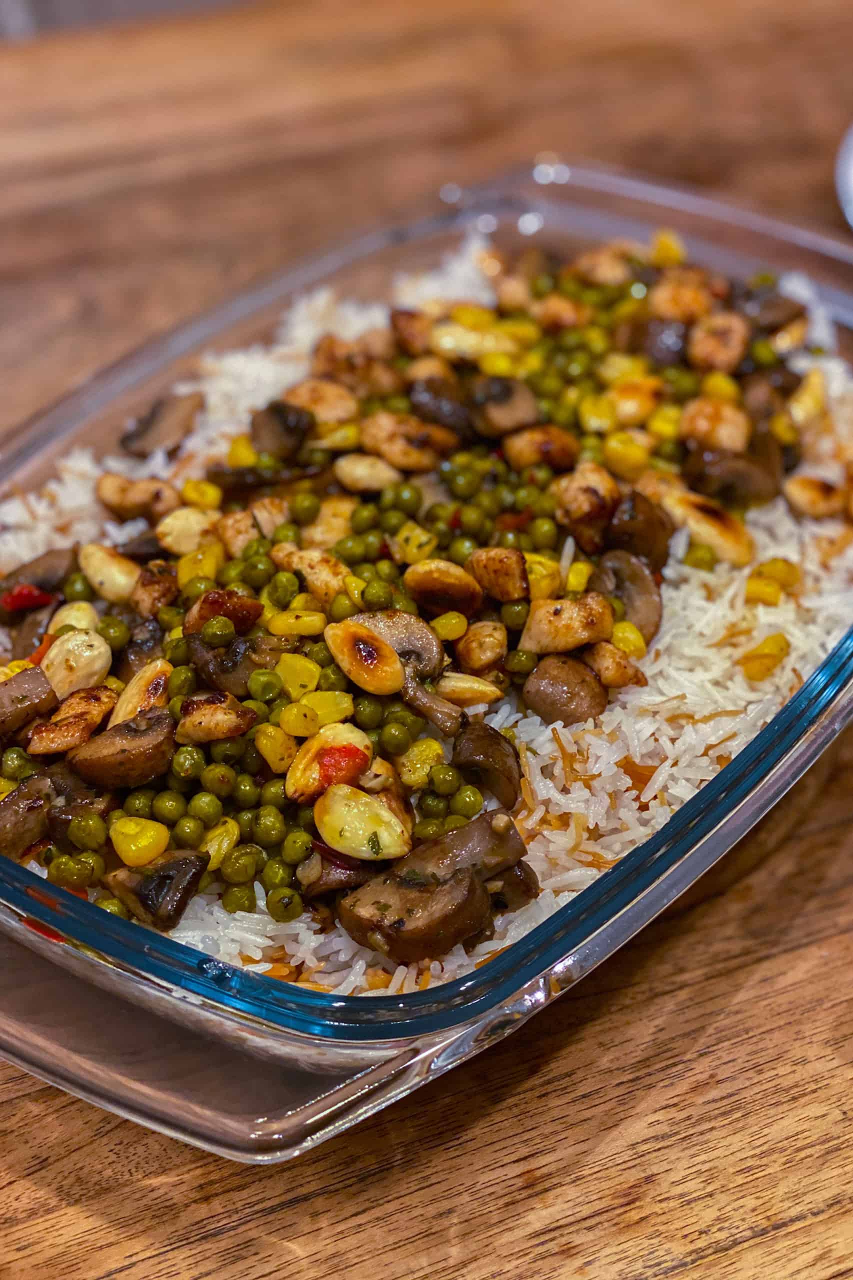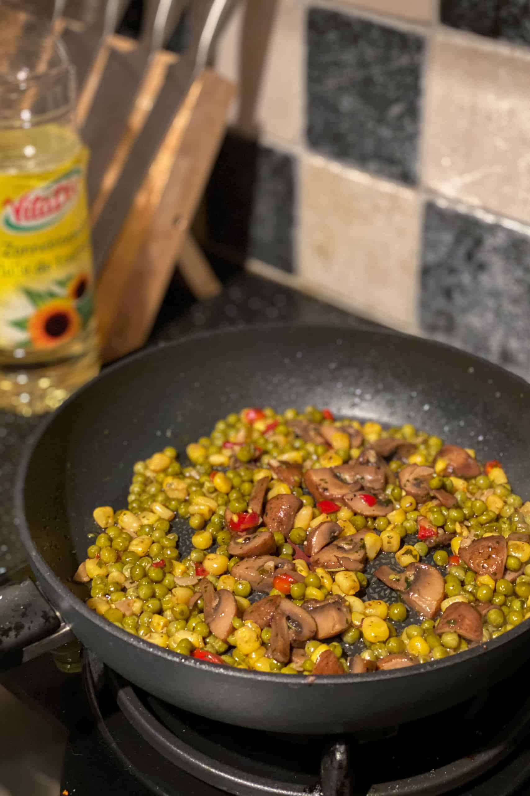 - In de tussentijd maak je de ‘topping’ voor je feestrijst. Ozhan bakte daarvoor wat blokjes kipfilet (circa 100 gr) bruin aan met biryanikruiden. Maar daarvoor kun je je favoriete kipkruiden gebruiken die je al in huis hebt. Verder bakte hij ook nog circa 100 gr doperwten, mais en paprika (Tip: de Mexico melange van Bonduelle uit de diepvries is daar perfect voor) aan en wat champignons, met dezelfde kruiden. Uiteindelijk gaat alles bij elkaar in de koekenpan.