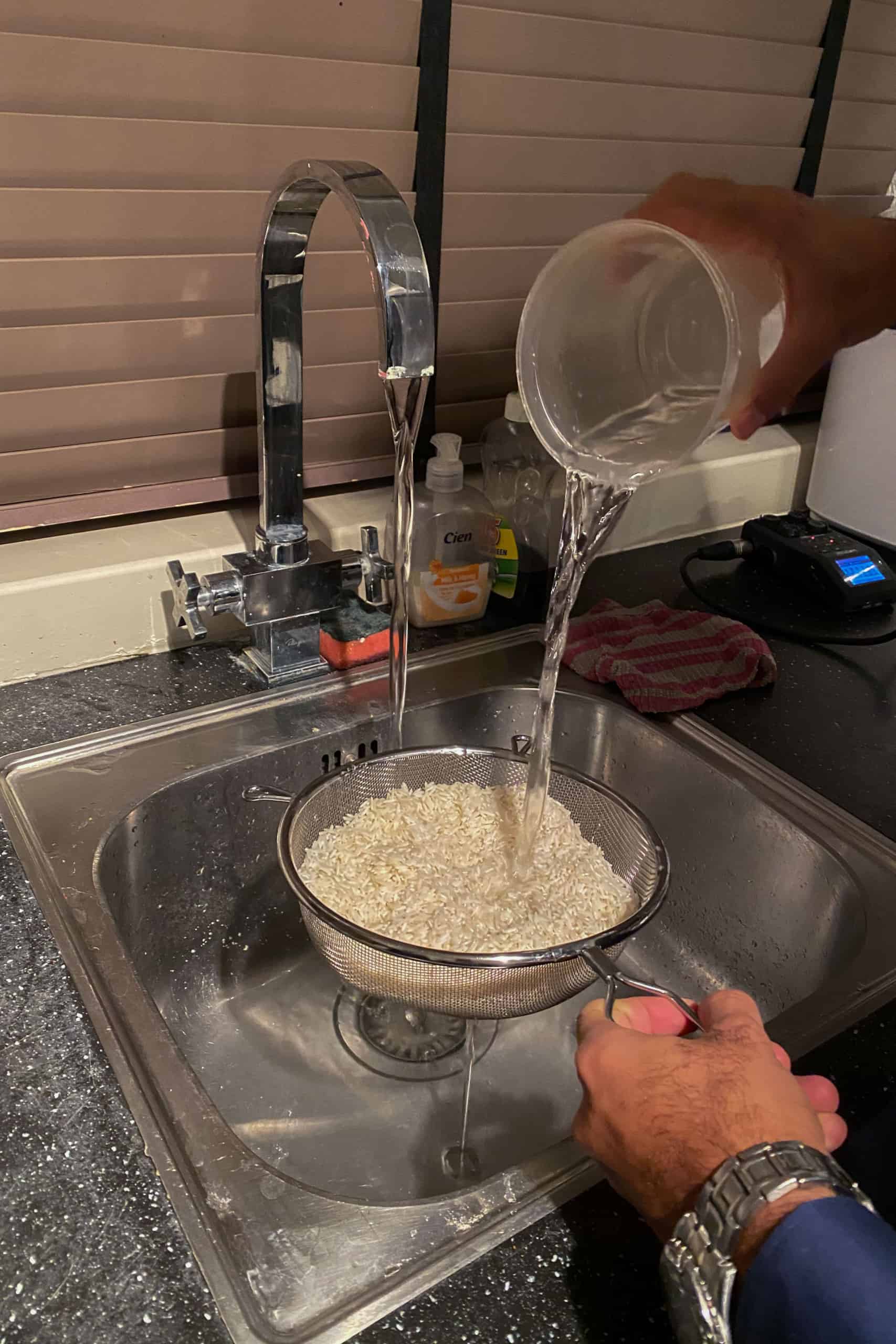 - Strooi de rijst in een fijnmazig vergiet en spoel goed met stromend water. Doe de rijst daarna in een kom of hoge maatbeker en schenk water bij tot de rijst helemaal onder staat. Laat 30 minuten weken en spoel daarna nog een keer in je vergiet. Nu is de rijst klaar om verder te verwerken.