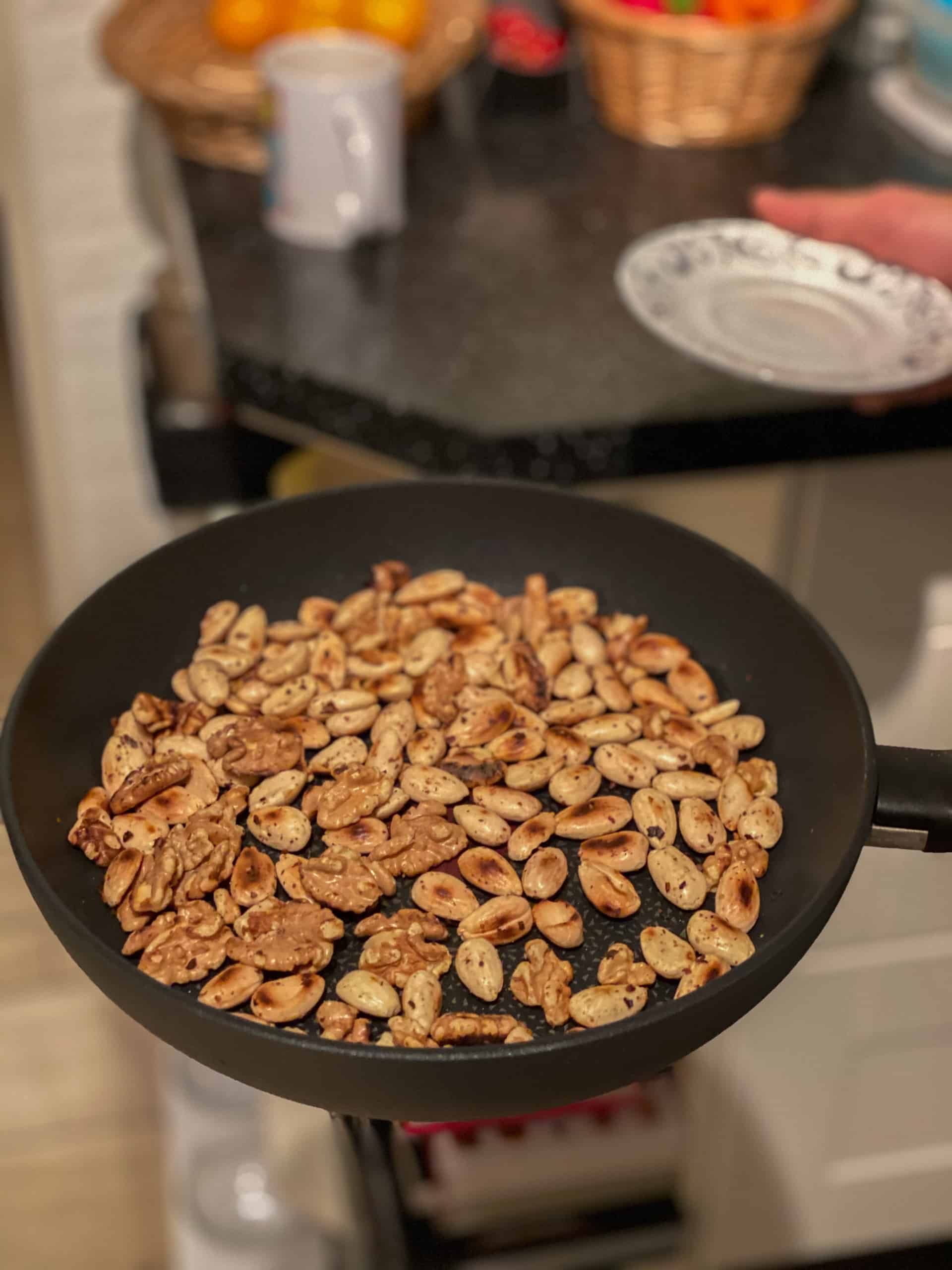 - Rooster in de tussentijd de amandelen en walnoten in een droge koekenpan tot de noten bruin zijn. Hou een klein beetje achter voor de feestrijst (zie recept hieronder).