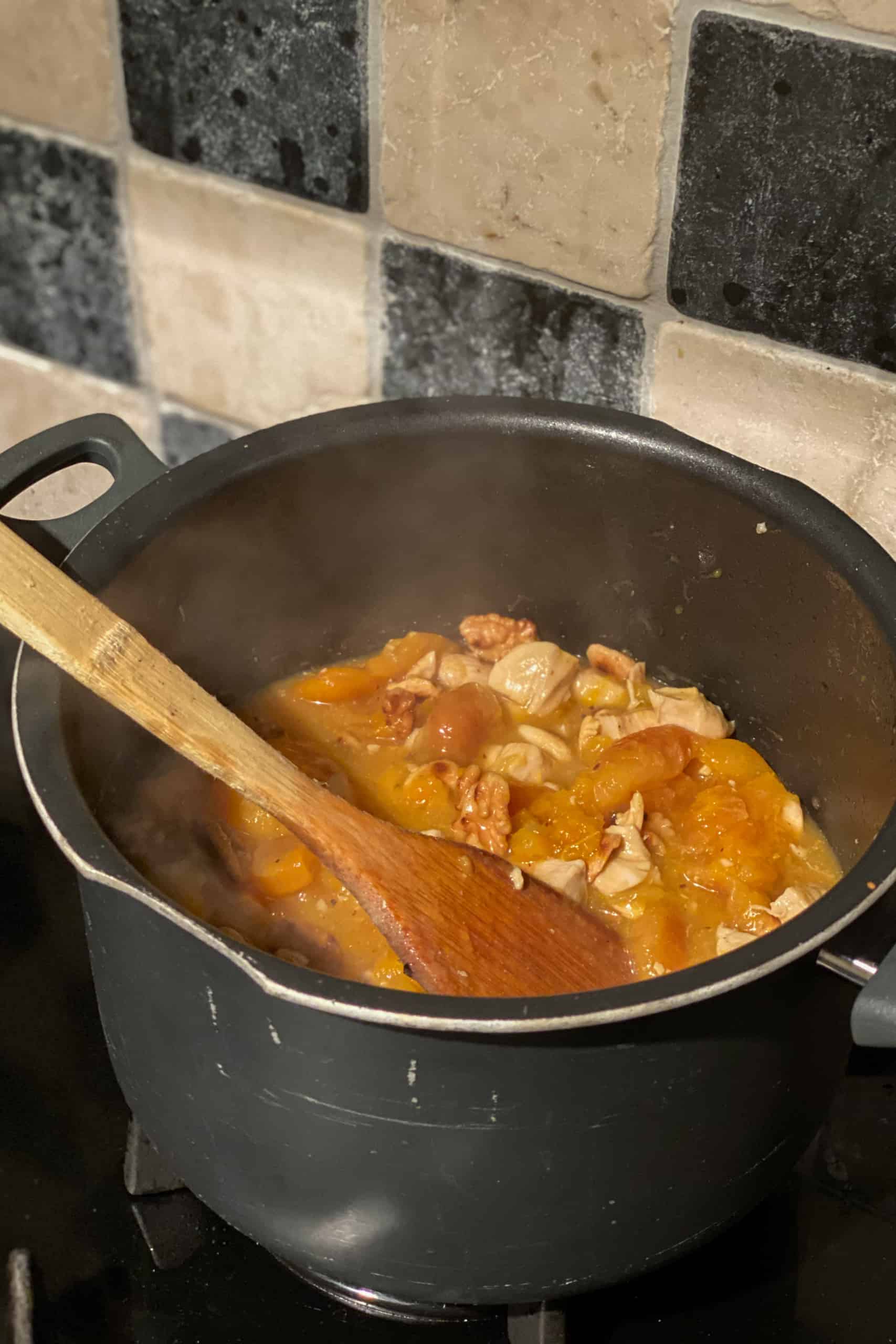 - Voeg de stukjes abrikozen toe en schenk het hete water in de pan. Zorg dat de kip en abrikozen net onder water staan, voeg eventueel extra water toe. Roer de honing en koek- en speculaaskruiden erdoor en laat circa 45 – 60 minuten stoven op laag vuur. Tussendoor roer je steeds even en als de abrikozen zachter worden druk je ze een beetje plat met je pollepel. De bedoeling is dat de abrikozen uiteindelijk een confiture-achtige structuur krijgen. Dit duurt ongeveer 45 – 60 minuten.