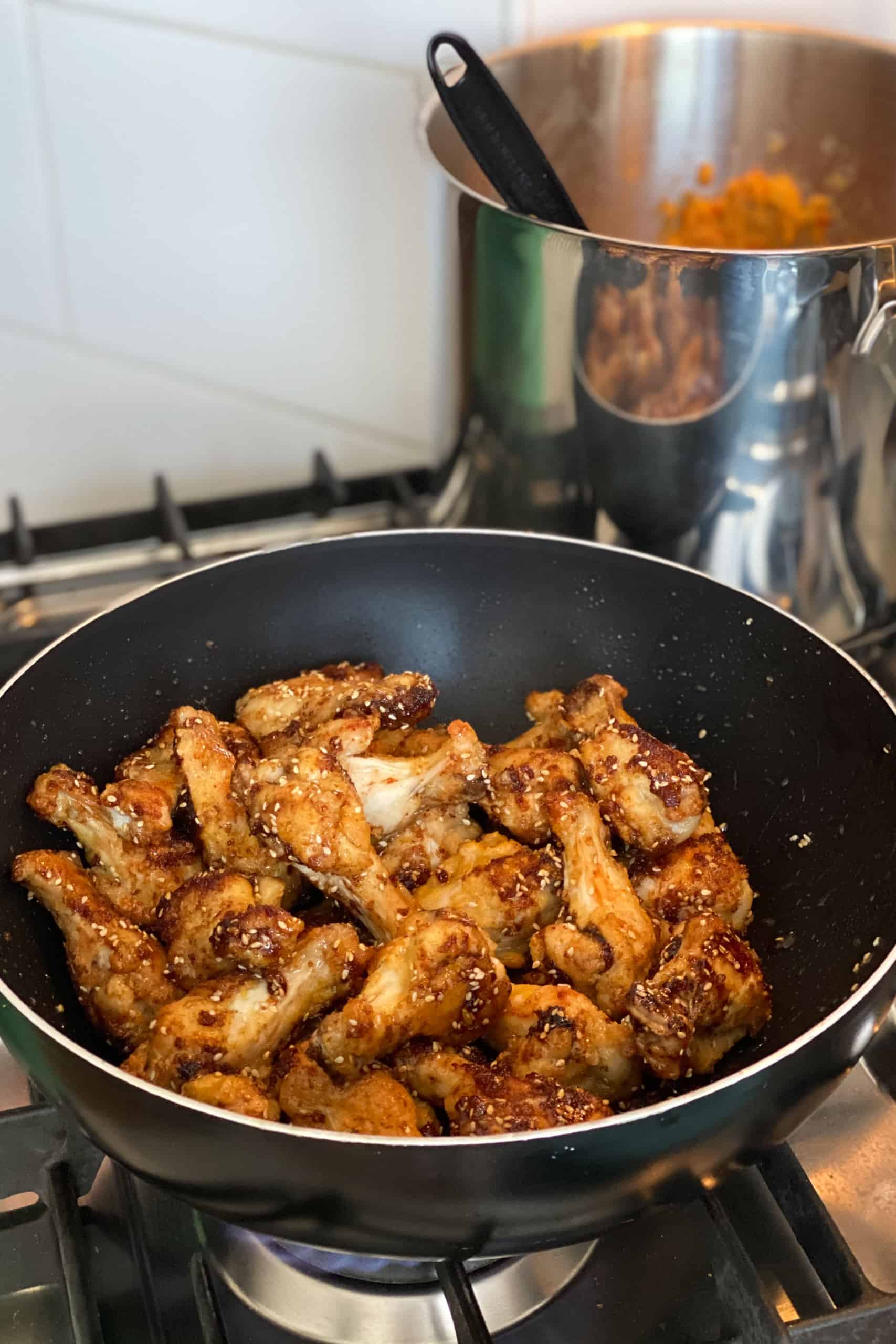 - In die tijd kun je de sticky kip afmaken. Verhit hiervoor een grote hapjespan of wok met olie. Doe de kip in de pan en voeg een flinke scheut sojasaus, 2 volle eetlepels bruine basterdsuiker en 2 volle eetlepels sesamzaad toe. Roerbak dit nu tot de suiker helemaal is opgelost en is gaan karamelliseren. Zet daarna het vuur uit en schep je kip over in een schaal.