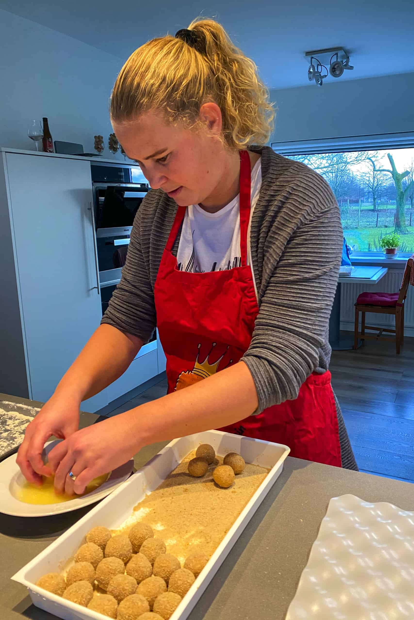 Voor de beste uitleg van het portioneren, rollen, paneren en bakken: check dit artikel van Ilona zelf!