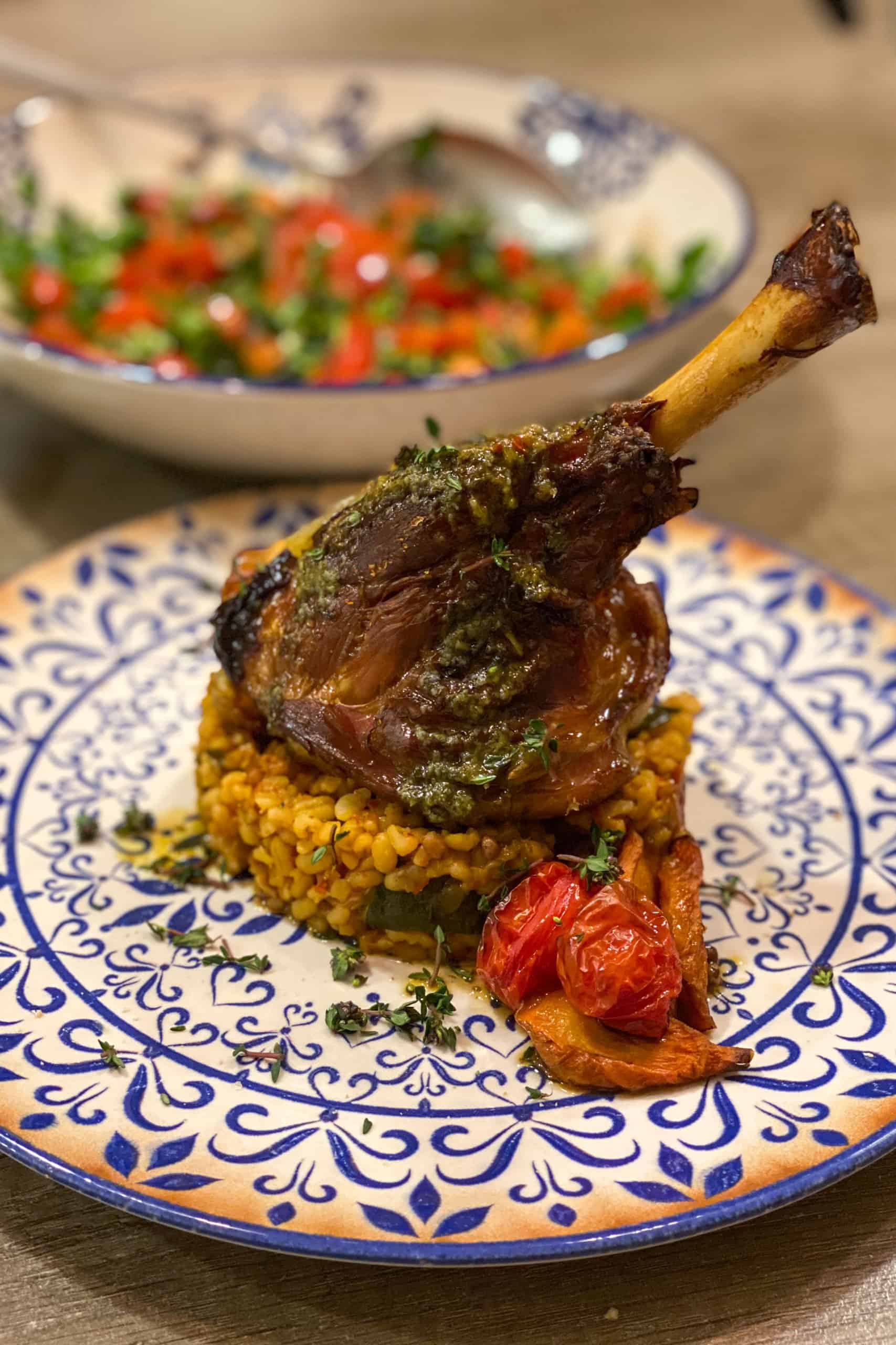 “Afijn, De lamsschenkel serveer ik op een bedje van bulgur en als finishing touch smeer ik de schenkels in met Moonspesto. Ik proef ze terwijl ik dit nu aan het typen ben voor jullie.” – Hilal