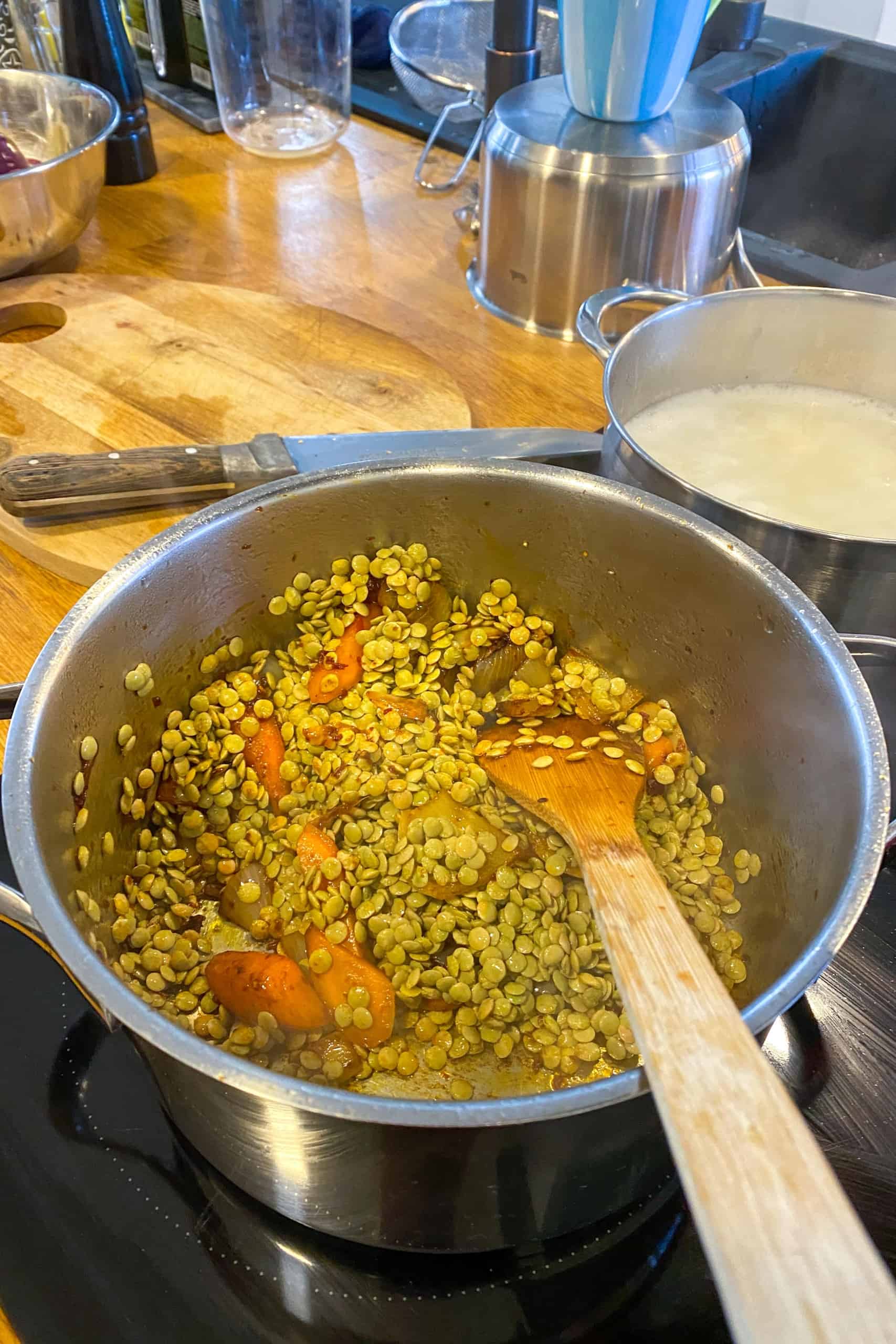 - Voeg vervolgens de linzen, zout, peper en chilivlokken toe, hussel alles door elkaar en voeg vervolgens 1200 ml water toe en breng deze aan de kook.