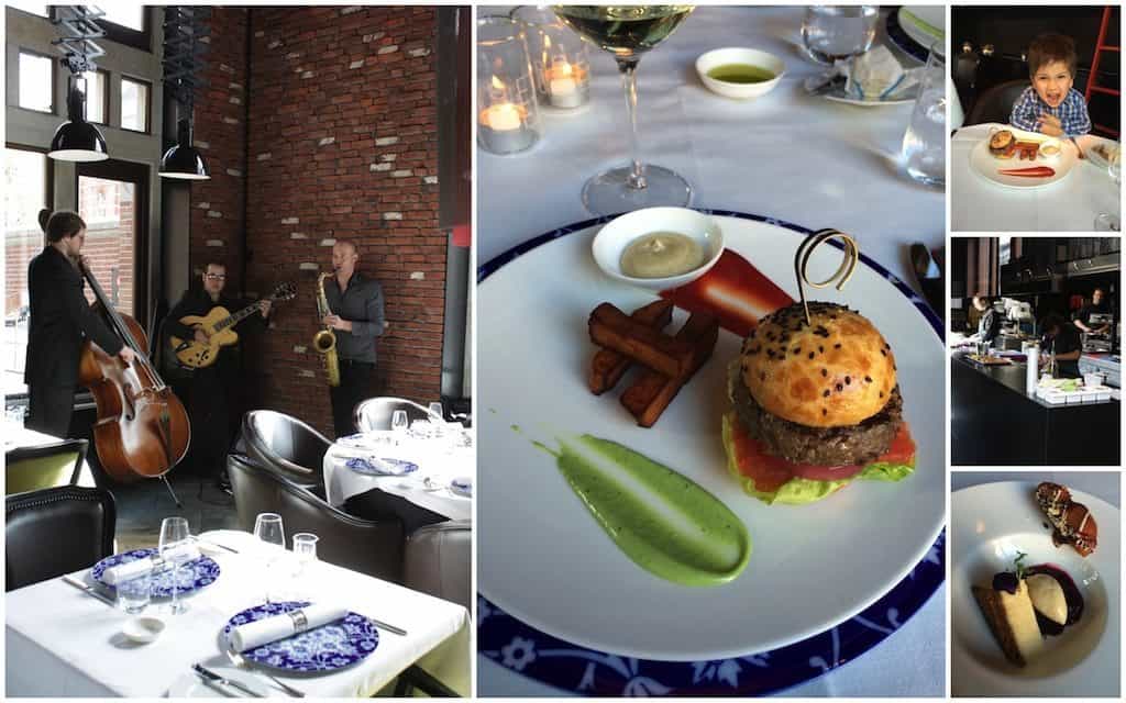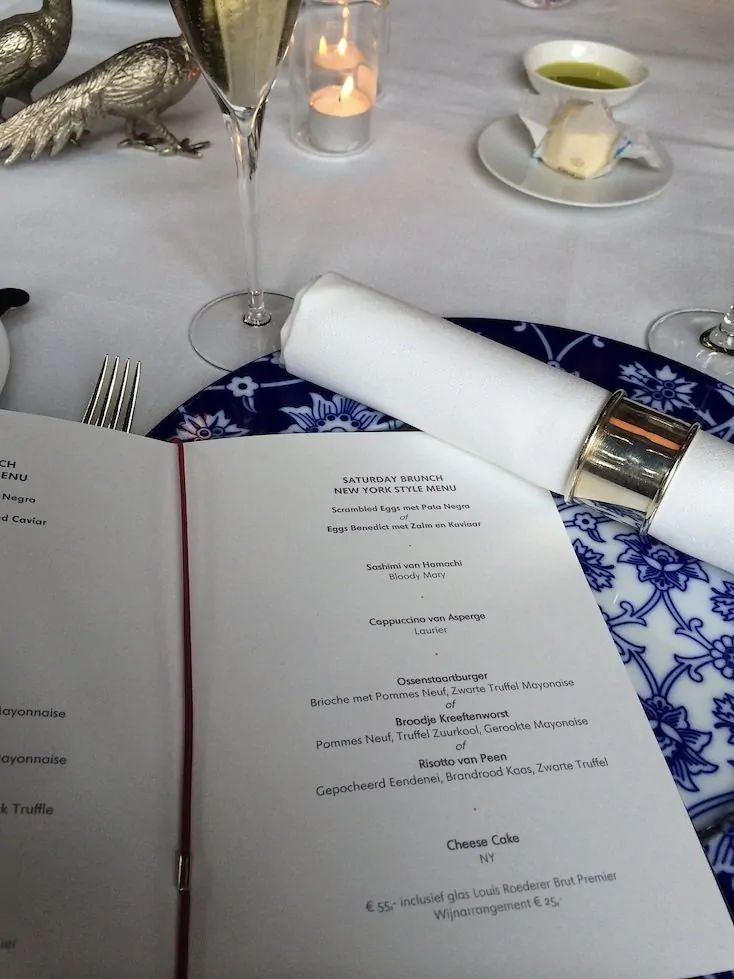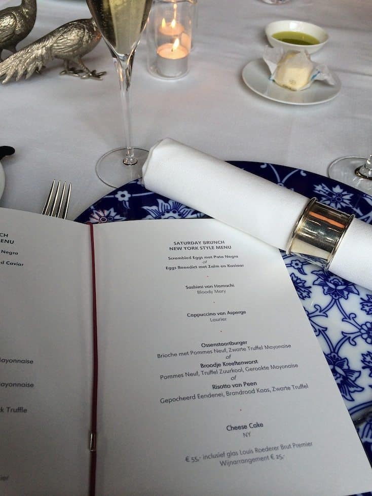 We nestelden ons aan een ronde tafel in de hoek samen met de peuter. Die het direct goed naar zijn zin had, want hij kreeg een broodje, water met bubbels en dat alles terwijl hij languit in de stoel kon liggen. Wat wil een peuter nog meer. Wij begonnen de brunch met een glas champagne (inbegrepen in het menu). In het menu zijn een aantal keuzes opgenomen, zowel in het voor- als hoofdgerecht. Het volledige menu kun je hier bekijken.