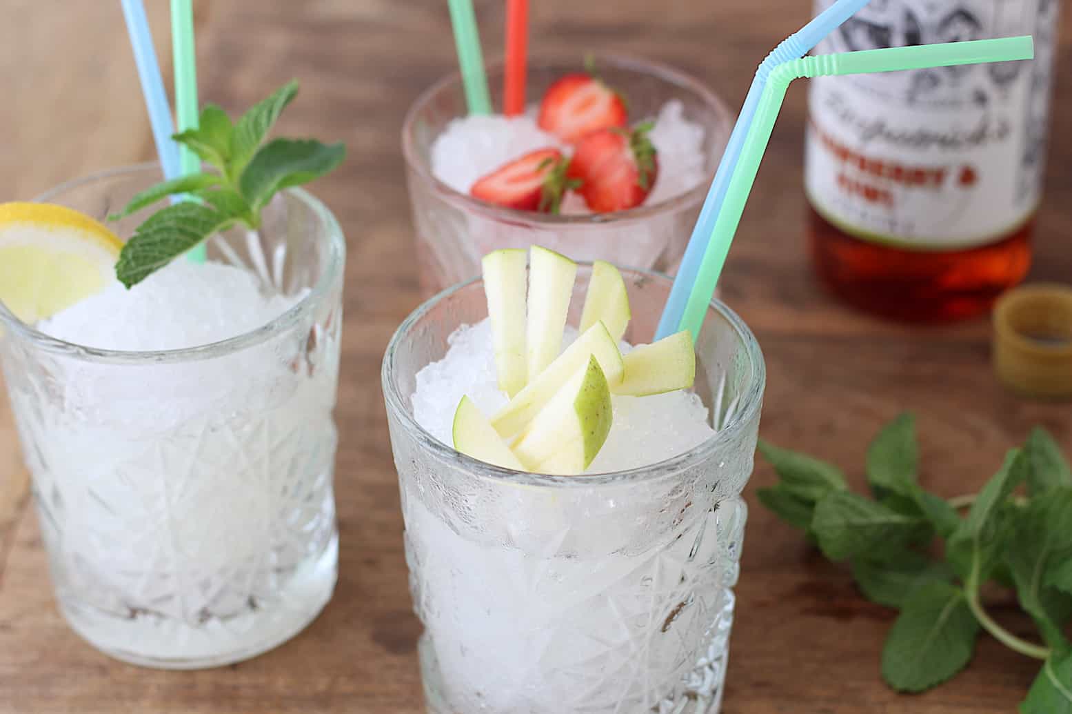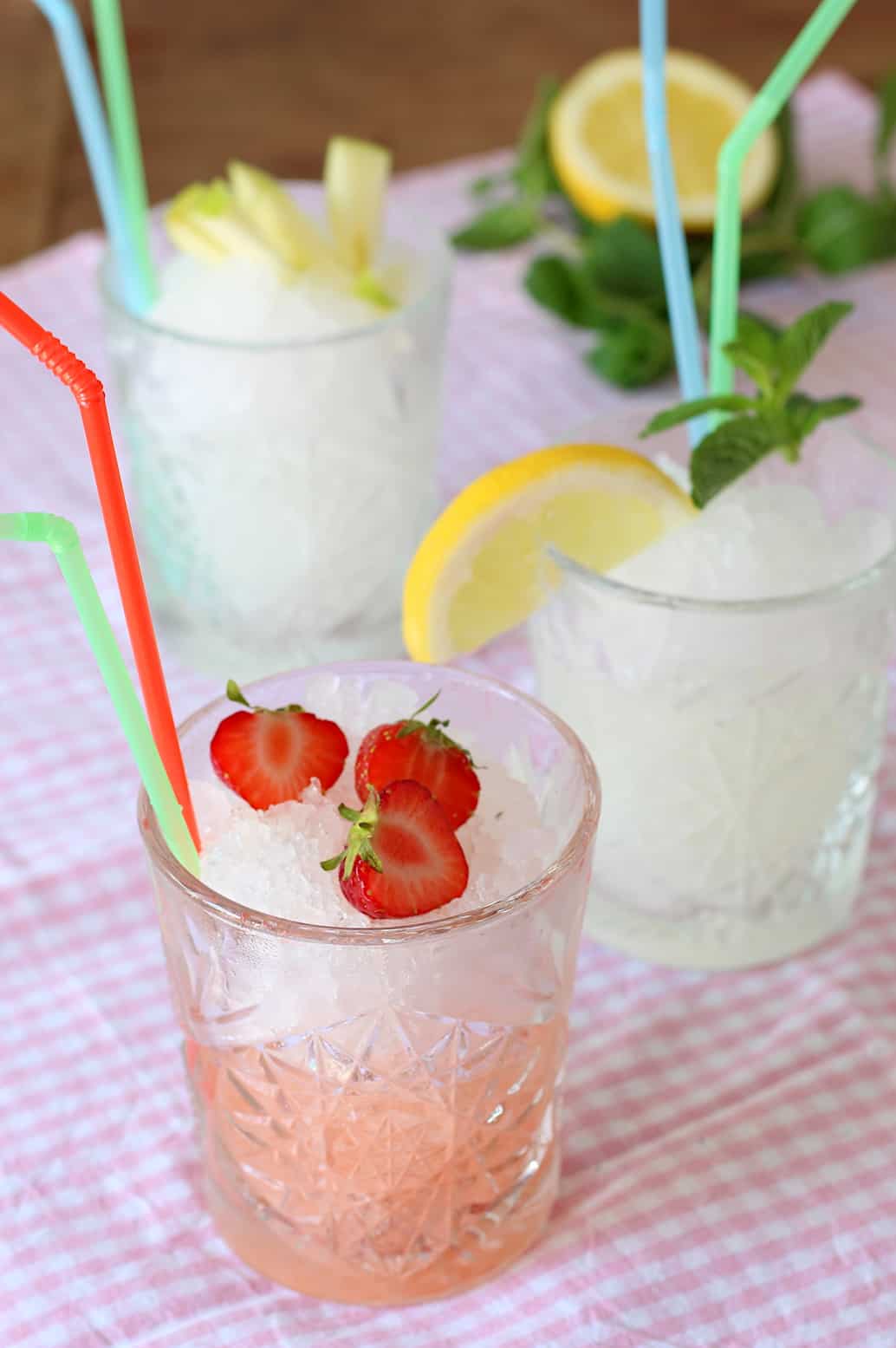 Tip voor een feestje: haal felgekleurde limonadesiropen in huis en maak daarmee regenboog schaafijs door de verschillende kleuren (rustig) op elkaar te schenken in een glas.
