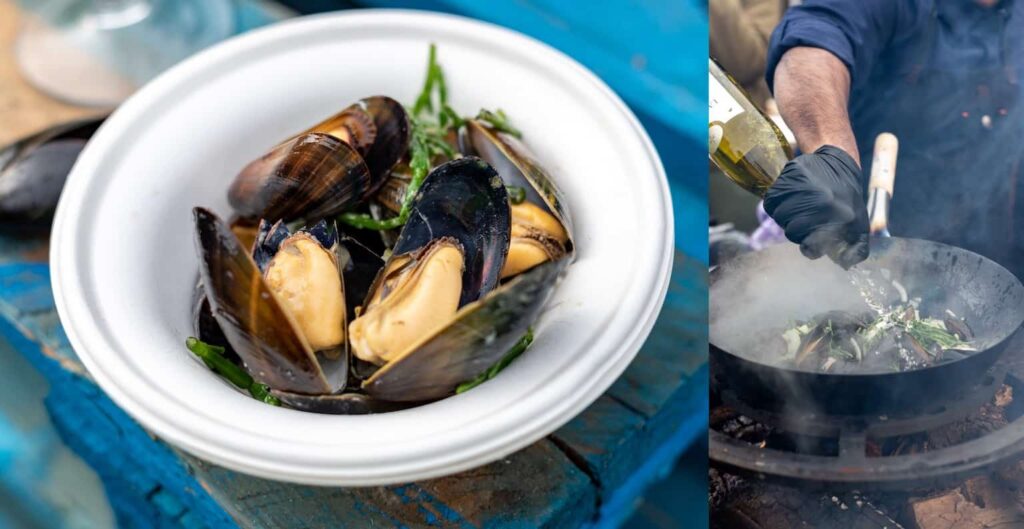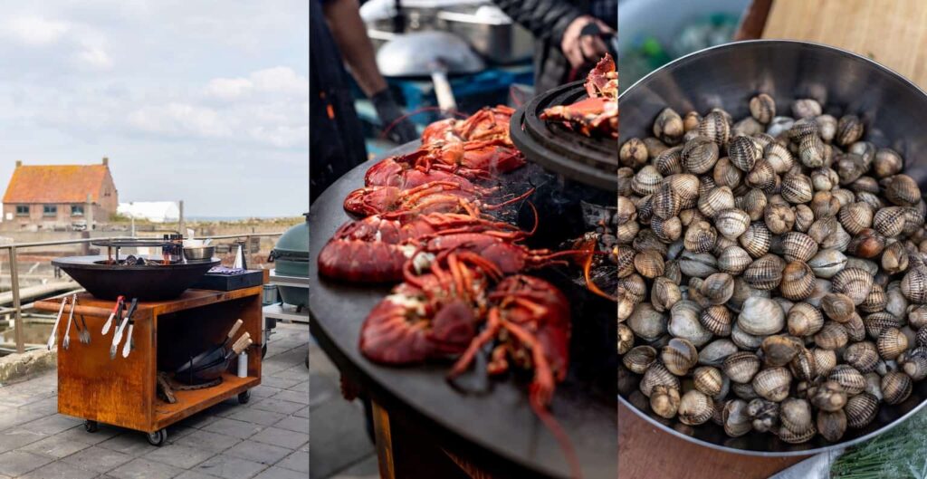 De stemming zat er dan ook goed in toen we zagen wat er allemaal voor ons klaar stond op de Oesterputten. Een Big Green Egg en de barbecue van mijn dromen: een Ofyre! Wat een knap ding. Hier gingen we, onder de gezellige leiding van de heren van Taste Culinair, leren hoe we oesters, kokkels, vongole, scheermessen, mosselen én prachtige Oosterscheldekreeften klaar kunnen maken.