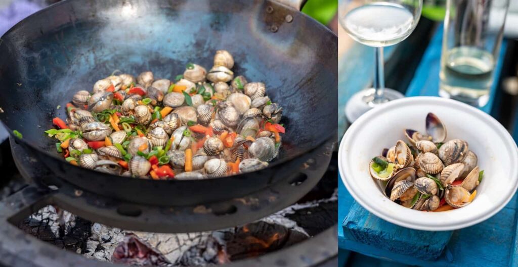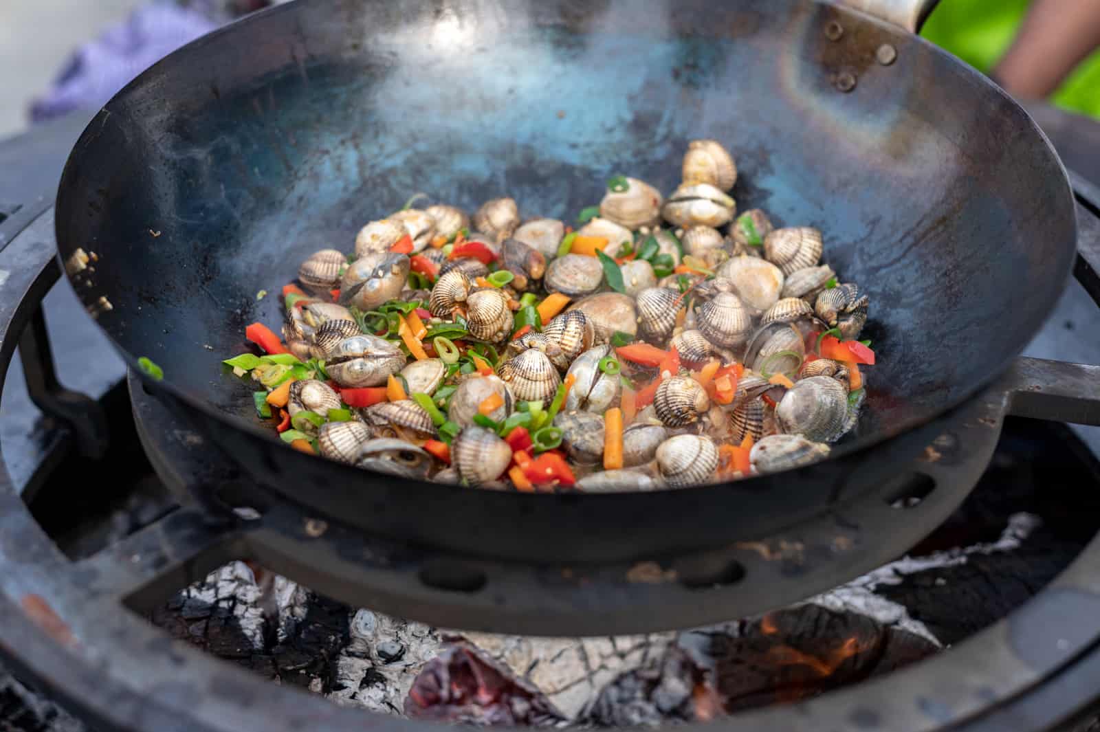- Voeg dan ook de kokkels en roomboter toe en wok in 3 – 4 minuten gaar met de deksel op de pan. Schud de kokkels af en toe om. De kokkels zijn gaar als ze open staan.