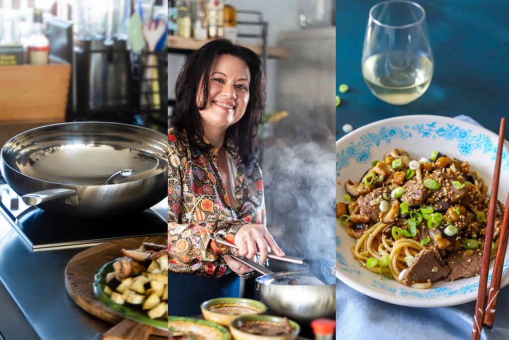 - Fruit de sjalotten, knoflook, gember en Spaanse peper in een scheut bakolijfolie.