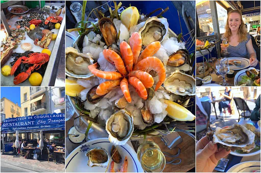 De eerste en misschien wel allerbeste reden om Sète te bezoeken is omdat je er de allerlekkerste en meest verse vis kunt eten. Zowel vanuit de zee als vanuit het meer vind je er verschillende vissoorten in de vele visrestaurants die het stadje kent. Een van mijn favoriete restaurants is Chez Francois. Dit restaurant vind je direct aan het Canal Royal, het hart van de stad. Het terras is niet groot en wel erg druk en de menukaart is alleen verkrijgbaar in het Frans, maar dat maakt allemaal niet uit want de sfeer én het eten is fantastisch. Van verse mosselen, oesters, kreeft, garnalen tot aan hele gebakken vissen, je hebt het er allemaal. Zelf ging ik voor een schaal vol fruits de mer, en die smaakte net zo goed als dat ie er uit ziet 😉
