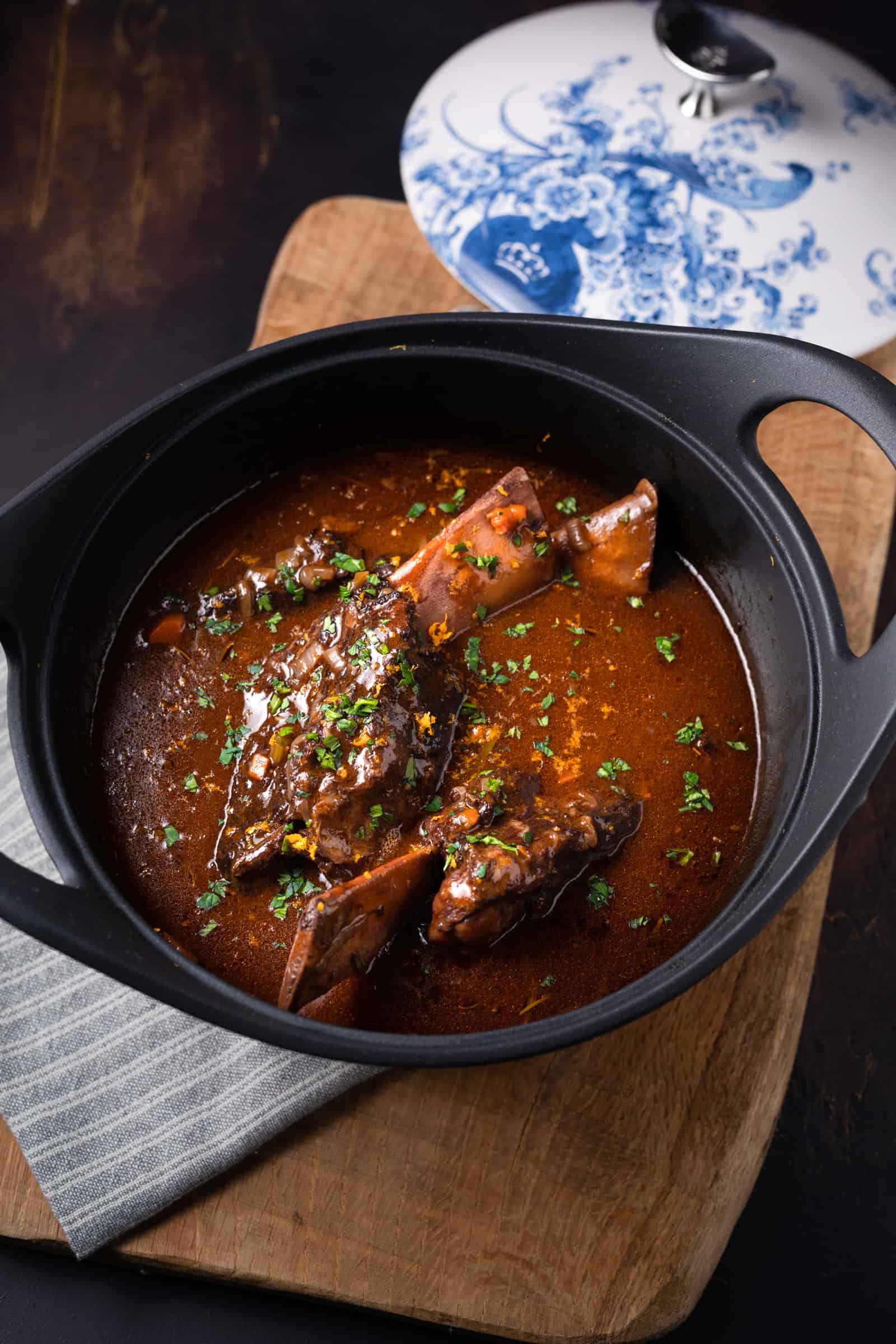 - Serveer de short ribs in een diepe schaal of op borden met de saus. Rasp er wat sinaasappelschil over en bestrooi met fijngehakte peterselie.