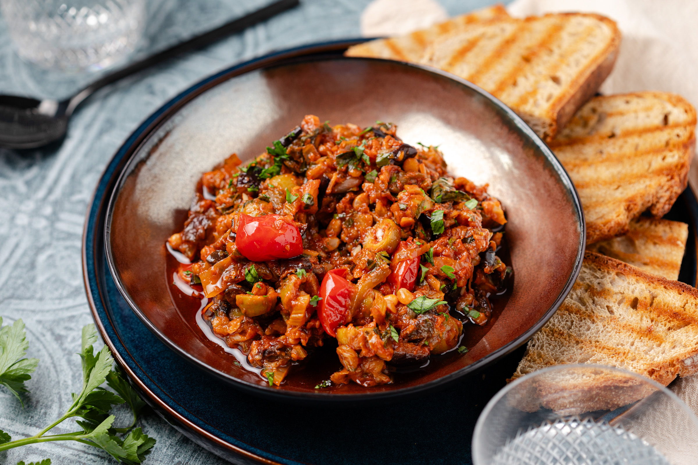 - Tip: Maak de caponata bij voorkeur een dag eerder en bewaar deze na het afkoelen in de koelkast. Zo ontwikkelt de smaak zich optimaal.