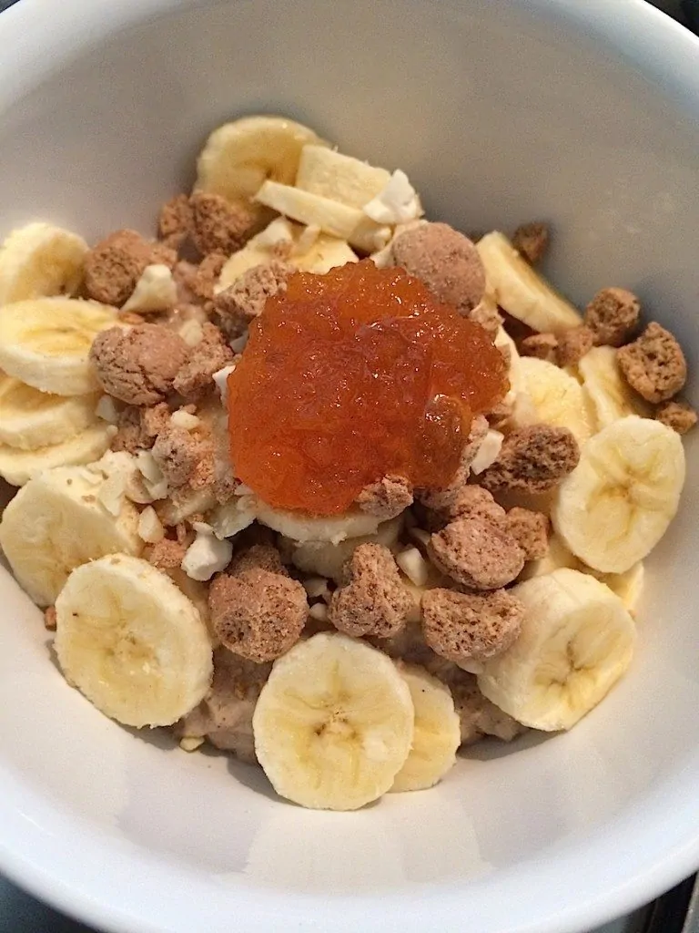 Verdeel de havermout over 2 bakjes. Snijd de banaan in plakjes en verdeel deze over de havermout. Bestrooi met de gehakte kruidnoten en amandelen en garneer met een toefje abrikozenjam. In mijn geval had ik pompoenjam en dat was amazing door de havermout. Maar dat is lastig verkrijgbaar in Nederland en daarom is abrikozenjam een goed alternatief. Of je laat de jam helemaal achterwege.