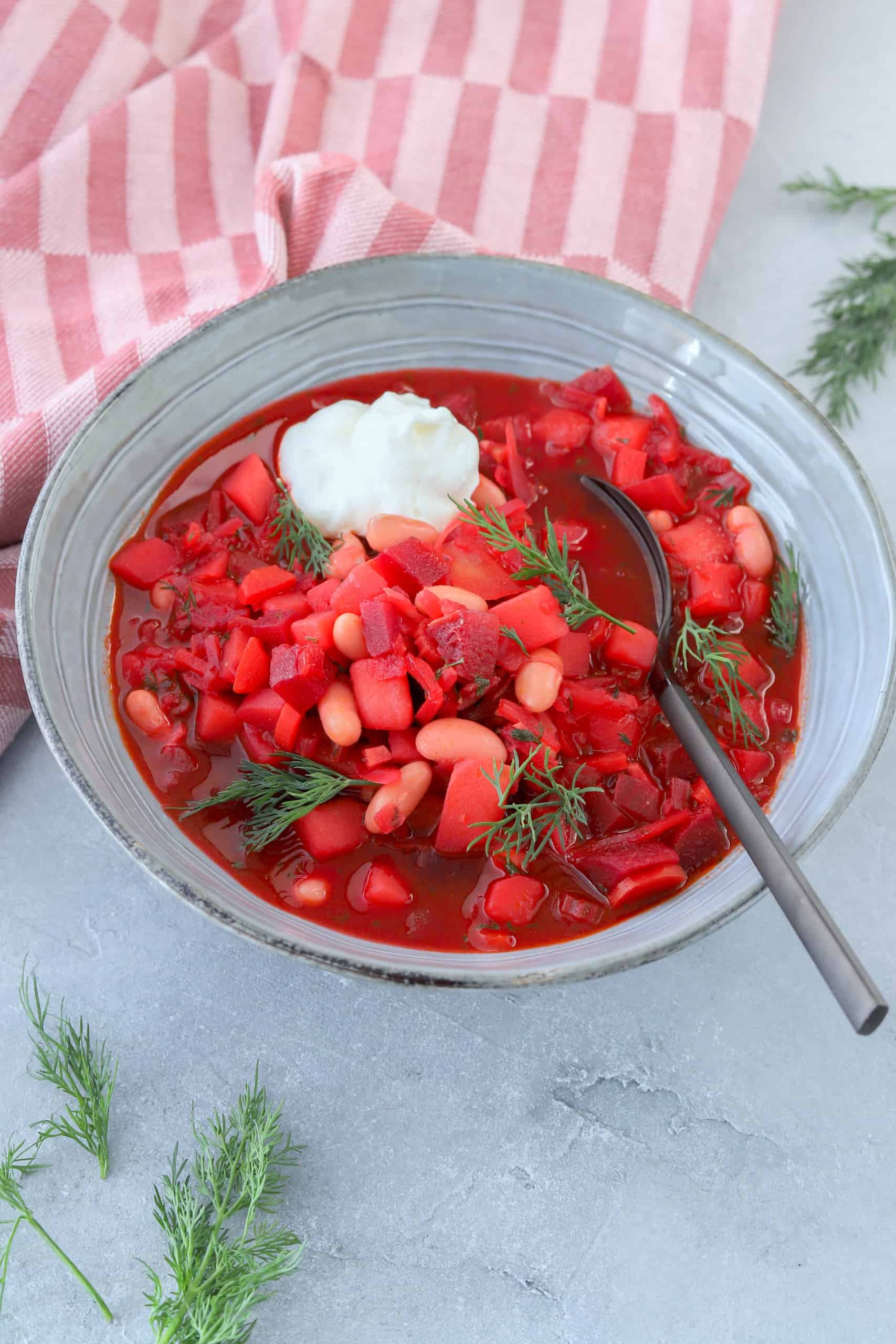 Ik ben aan de slag gegaan met mijn eigen variant, die deze keer vegetarisch is. En extra goed gevuld met naast bieten ook aardappel, kool en bonen. En ik voegde nog wat komijn toe (wat volgens mij niet gangbaar is), omdat ik de smaak van dit specerij zo mooi vind combineren met de zoete aardse smaak van bieten. Lang verhaal kort: deze bietensoep is fantastisch geworden, geniet ervan!