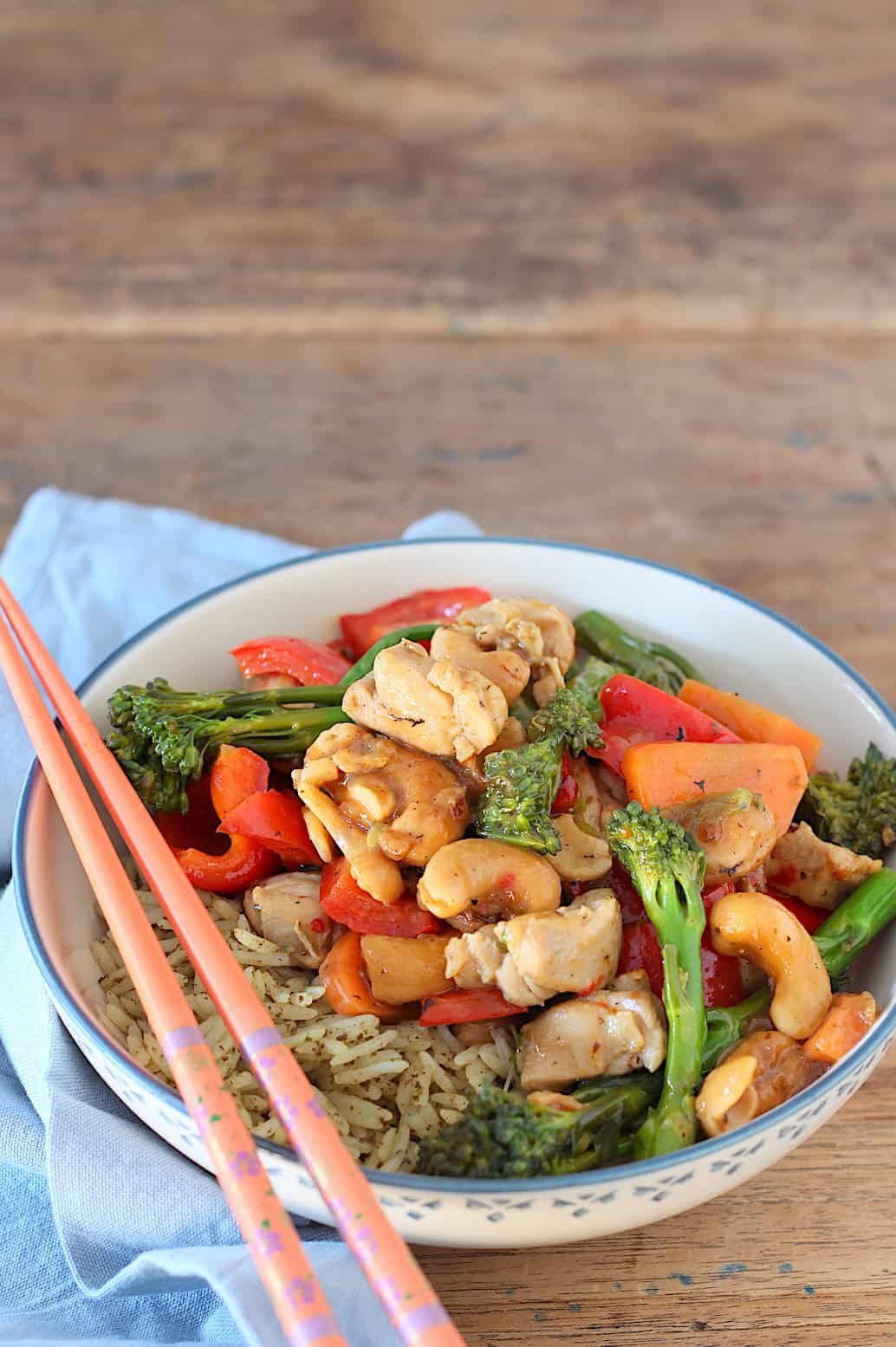 • Serveer de kip cashew met witte rijst. Op de foto zie je trouwens een andere soort rijst. Ik probeerde namelijk de gestoomde lime-coriander rijst van Tilda uit die je kunt opwarmen in de magnetron. Goedgekeurd!