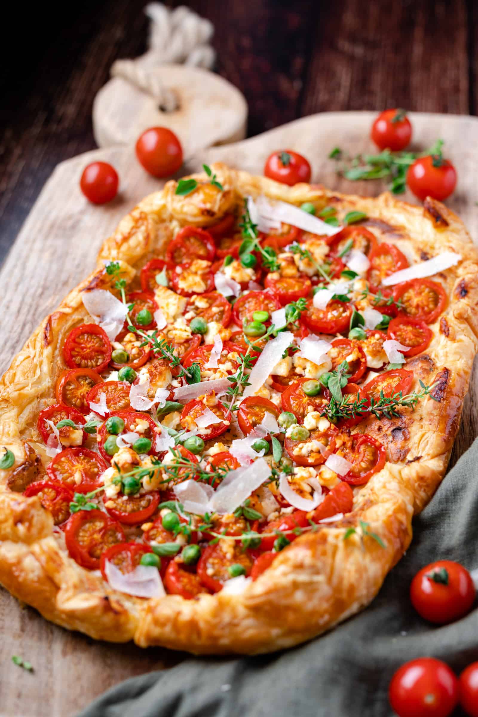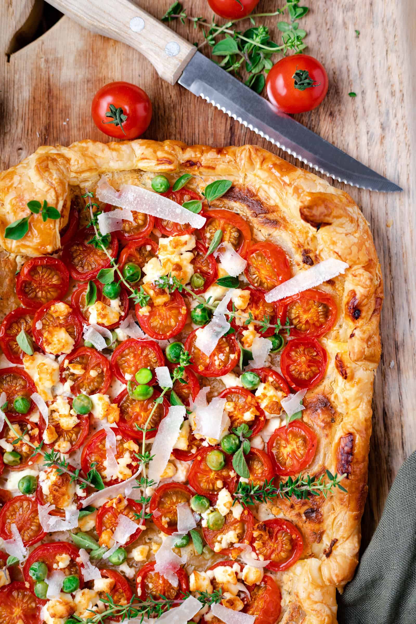 Ik weet dat ik in herhaling val door dit nog een keer te melden, maar echt: van kliekjes maak je de allerlekkerste gerechten. Zo had ik nog wat cherrytomaten, een stukje feta en een half bakje Boursin over die echt op moesten. En in de vriezer vond ik nog plakjes bladerdeeg. Voordat ik het wist stond deze snelle tomatentaart met feta en doperwten in de oven en wat een grandioos succes was dat! Heerlijke combinatie van smaken en snel gemaakt. Die houden we erin hier thuis.