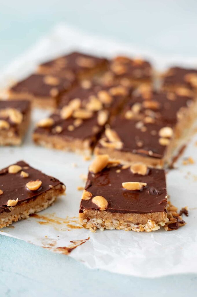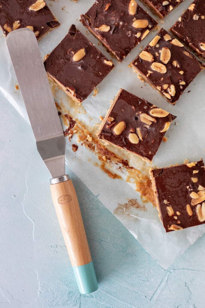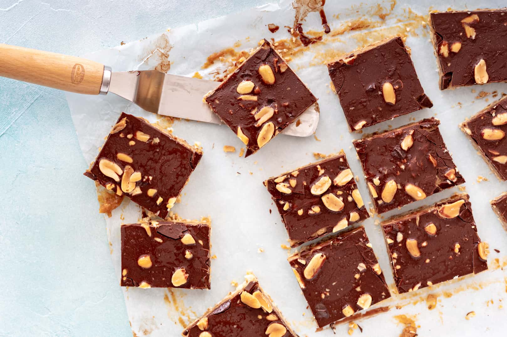 - Schenk de gesmolten chocolade gelijkmatig over de vulling en strijk eventueel glad. Strooi als laatste de grof gehakte pinda’s erover en eventueel wat zeezout flakes (maar houd dit subtiel).