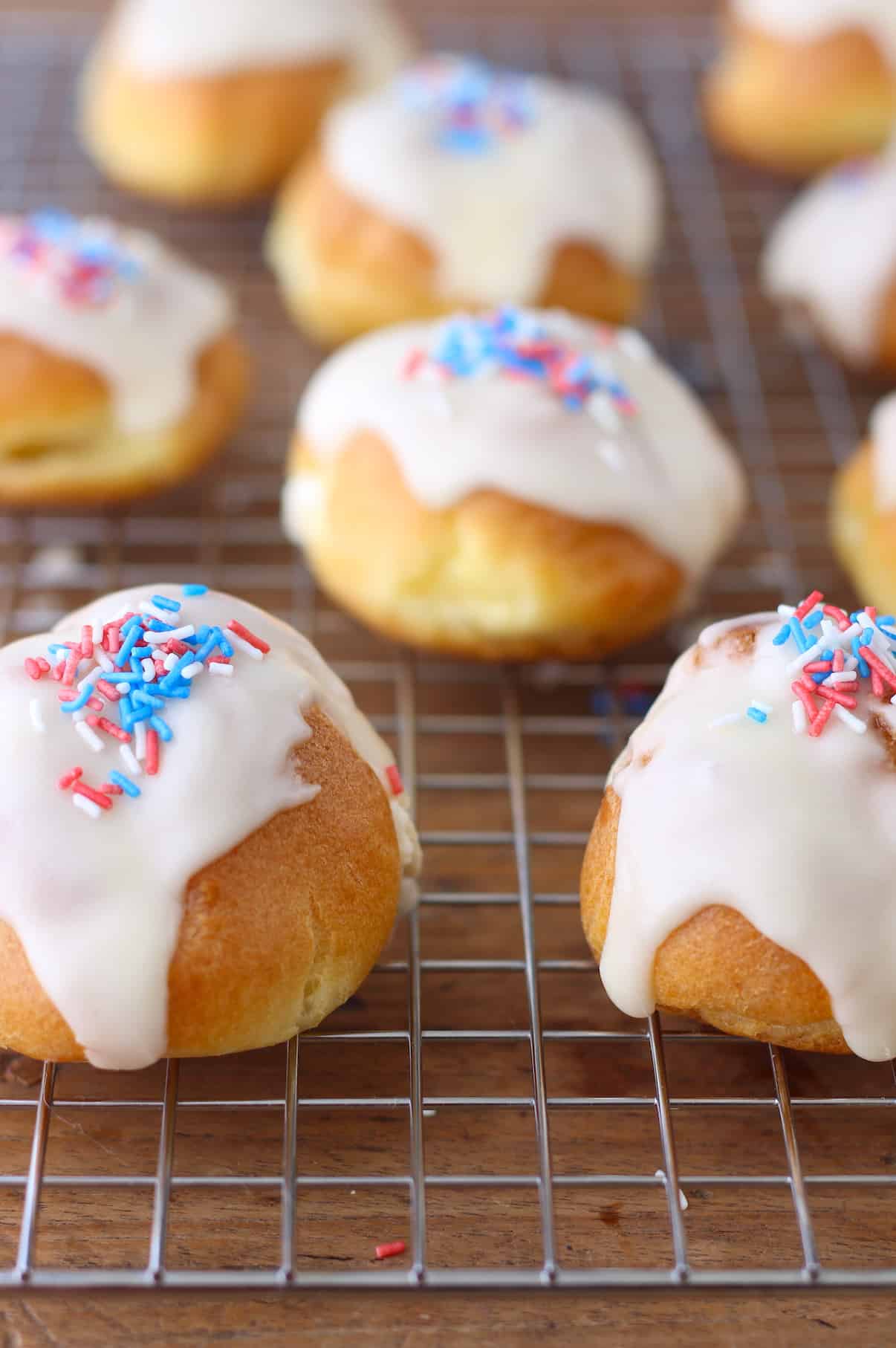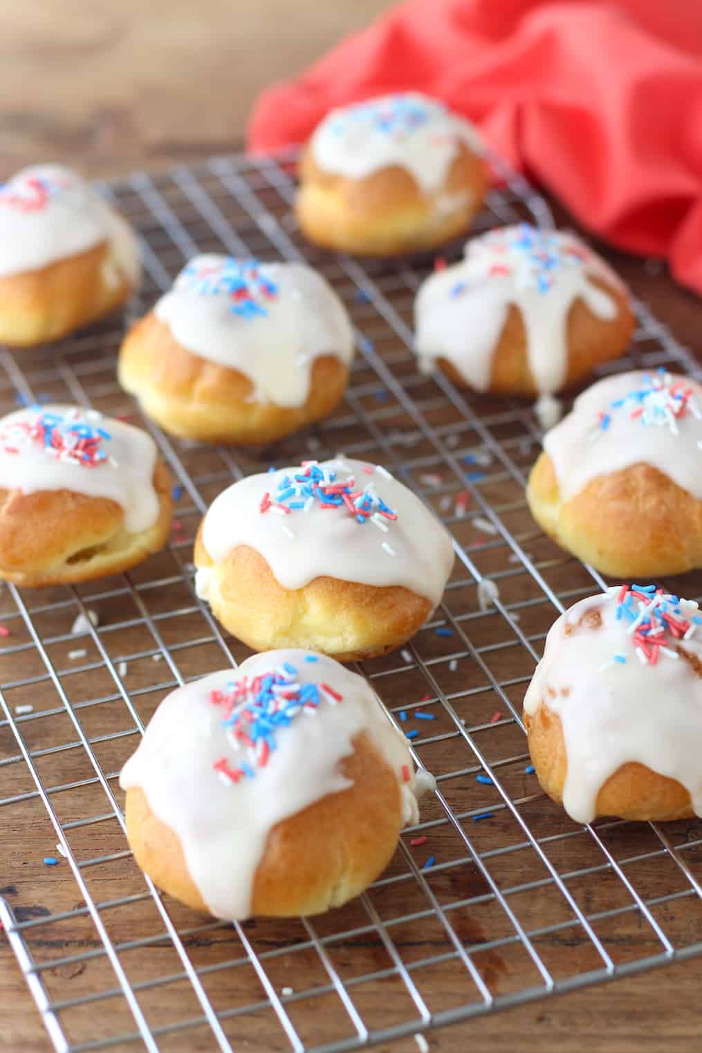 6. Strooi als laatste de rood-wit-blauwe spikkels over de soesjes als het glazuur nog niet helemaal is opgedroogd, anders zitten de spikkels vooral op de vloer.