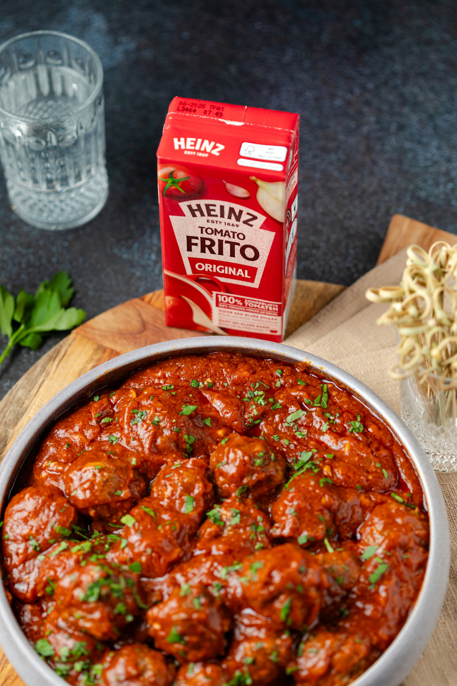 Voor mijn versie van albóndigas gebruikte ik Heinz Tomato Frito® als basis voor de saus. De langzaam gebakken ui en knoflook hierin geven een diepe, zoete smaak, terwijl de tomaten een pure, volle basis vormen. Dit zorgt voor een heerlijke tomatensaus waarin de gehaktballetjes perfect kunnen sudderen.