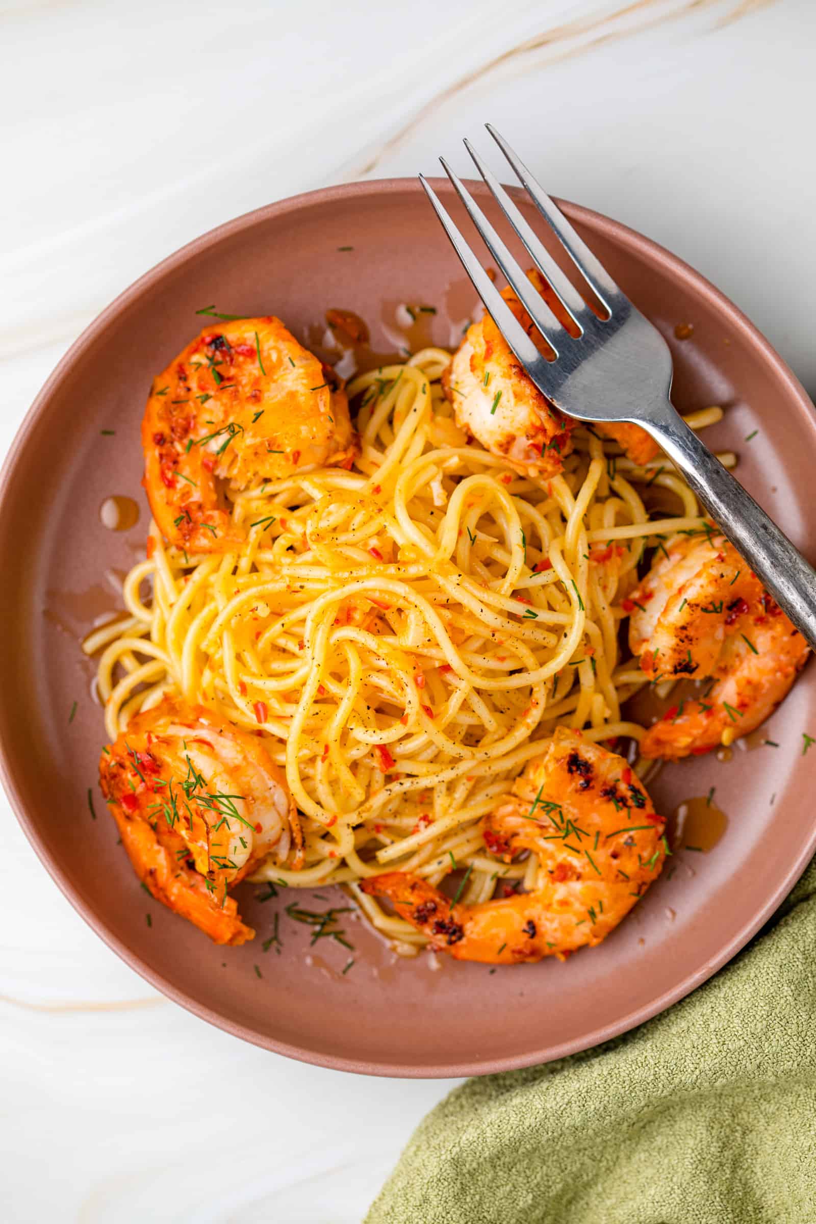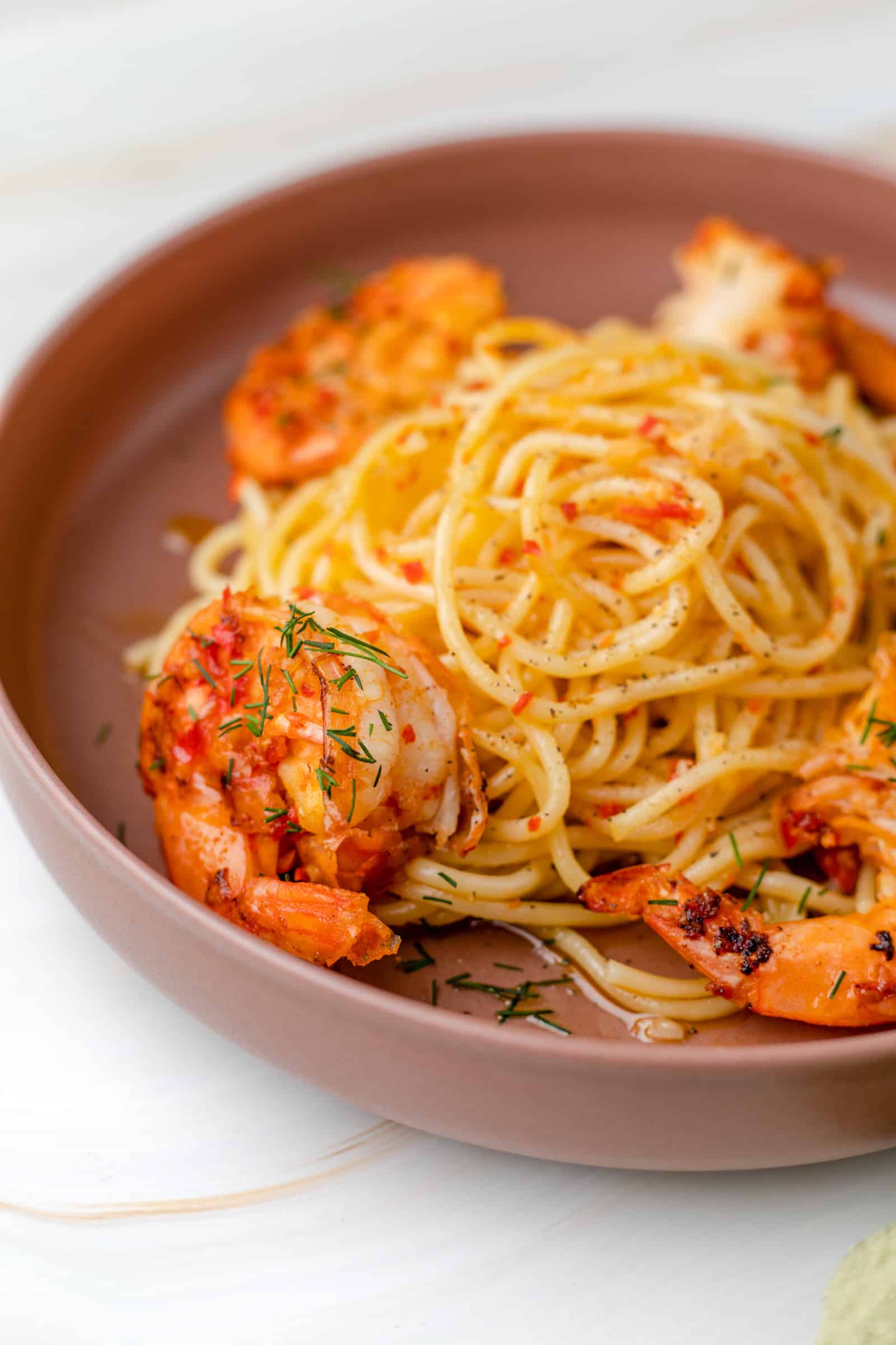 - Serveer de spaghetti aglio e olio met de grote garnalen en garneer met fijngehakte dille en een snufje zwarte peper.