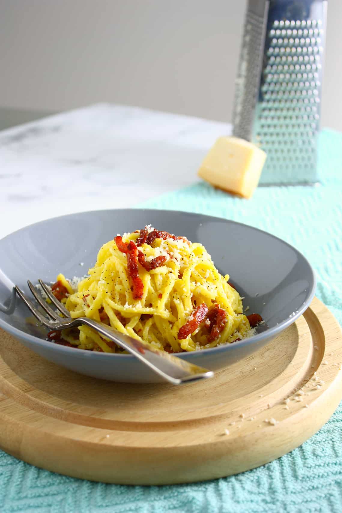 Wat jouw versie dan ook is,Ā je geniet in ieder geval van een heerlijke spaghetti en daar gaat het uiteindelijk natuurlijk ookĀ om. Dit recept voor spaghetti alla carbonara is onze favoriete versie en komt, als ik mijn bronnen mag geloven, dicht in de buurt van de originele Italiaanse spaghetti. Ik gebruik alleen gerookte spekjes in plaats van guanciale (kinnebakspek) omdat dezeĀ voor mij makkelijker te verkrijgenĀ zijn en daarnaast binnen mijn budget passen. Dat past prima in de carbonara filosofie, de kolenbranders (waar alla carbonara vandaan komt) aten deze spaghettiĀ namelijk in hun pauze alsĀ een goedkope, makkelijke en smaakvolle maaltijd.