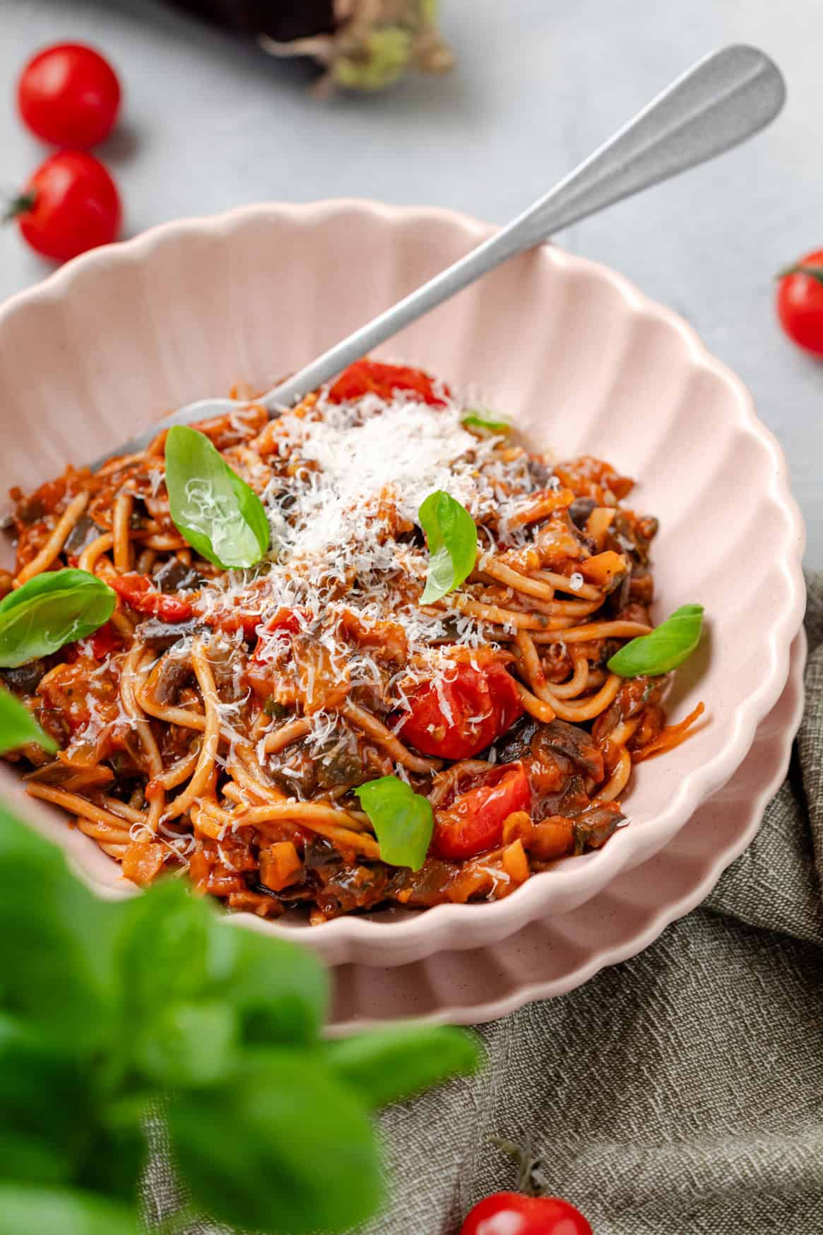 Een van mijn meest recente gerechten is deze volkoren spaghetti met geroosterde aubergine, tomaat en basilicum. Ik gebruikte wat minder pasta en wat meer groenten dan ik vroeger zou doen. En ik zorgde ervoor dat de groenten heerlijk intens van smaak werden. Wij vonden het een feest om te eten, geniet ervan!