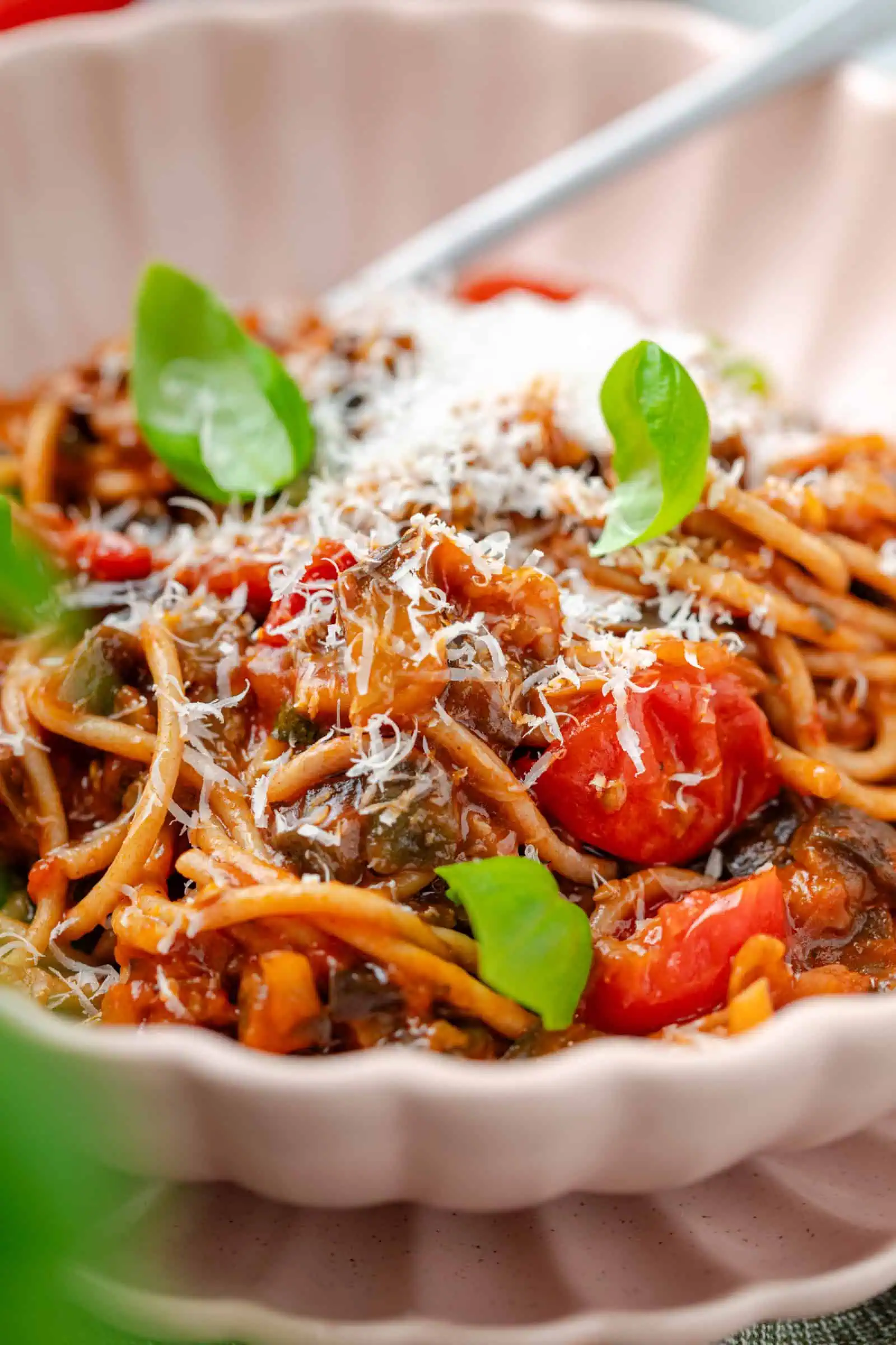 Deze spaghetti met geroosterde aubergine en basilicum is niet alleen bijzonder lekker, maar zit ook nog eens boordevol vezels. Als dat geen win-win situatie is!