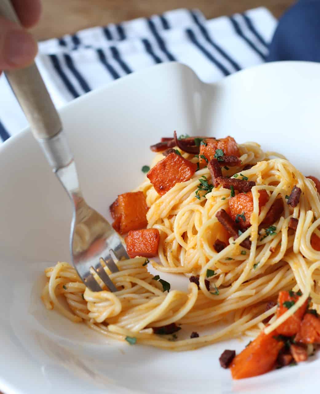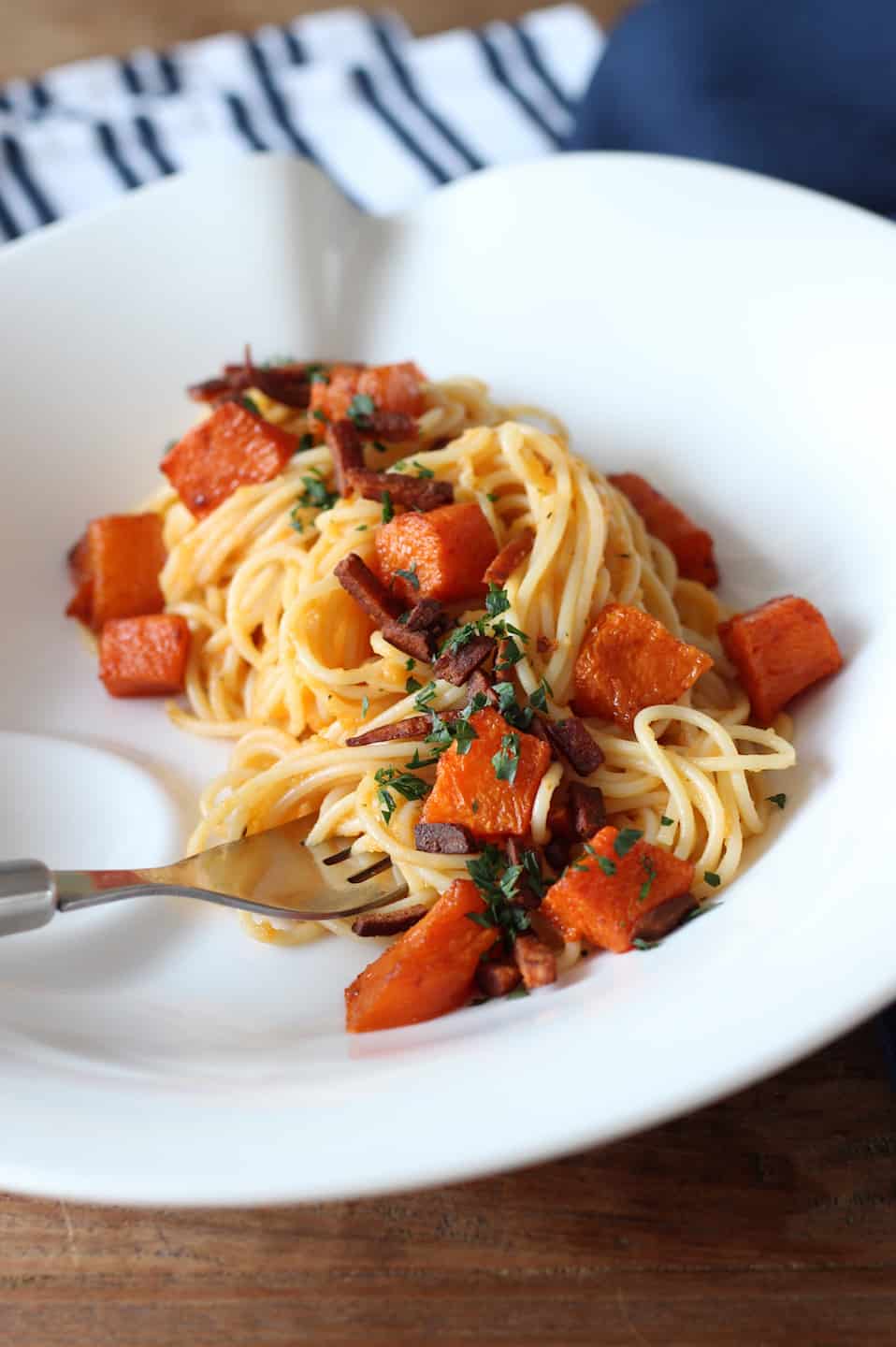 Pasta met pompoen is een van mijn favoriete combinaties in de herfst. Ik wilde graag een romige spaghetti met pompoensaus maken en dat is in dit recept meer dan gelukt. De saus combineert zalig met de geroosterde pompoenblokjes en spe(c)kjes. Waarbij je zelf kunt kiezen of je voor de ‘echte’ of ‘vegetarische’ uitvoering gaat.