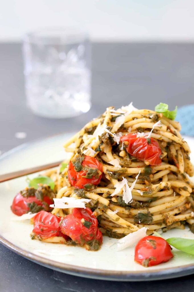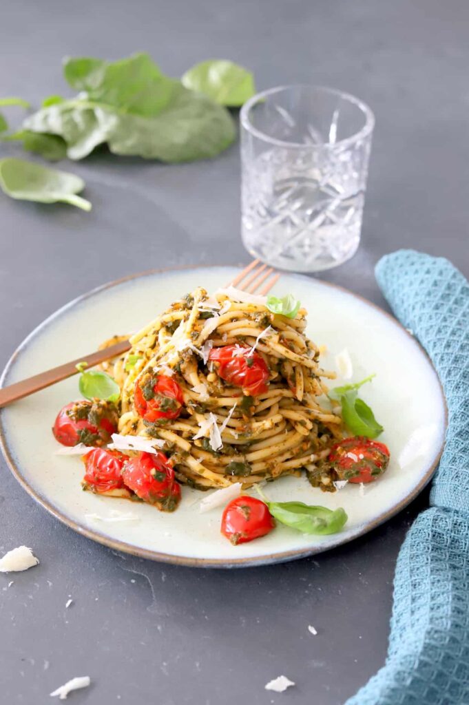 Voor mijn mannen en mijzelf kook ik graag met vers, goed eten. En dat gebeurt dus (vrijwel) iedere dag. Een van onze favoriete pastamaaltijden voor doordeweeks is deze spaghetti met spinazie en tomaat waar lekker veel spinazie in gaat en die heel romig is. De pasta is ook nog eens heel makkelijk om te maken.