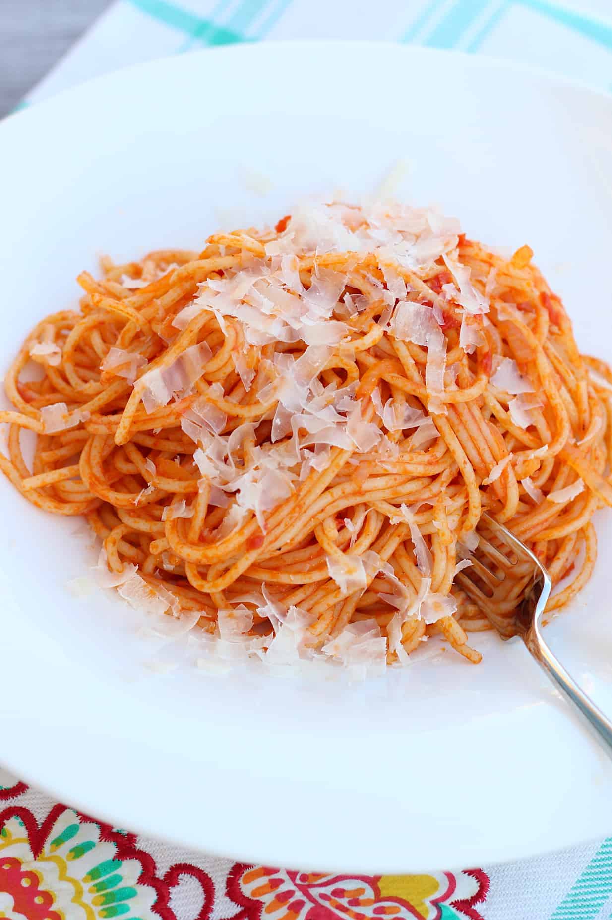 Koken hoeft echt niet altijd ingewikkeld te zijn. Nu er een baby in ons gezin is bijgekomen ben ik me daar nog sterker van bewust. Vooral doordeweeks probeer ik slimme recepten te bedenken die ik makkelijk kan voorbereiden tijdens een van de slaapjes van Zayne of die heel snel klaar zijn. Deze spaghetti met ui, tomaat en chili valt in de laatste categorie. Ik serveer er nog een grote salade bij zodat we allemaal voldoende groente binnen krijgen.