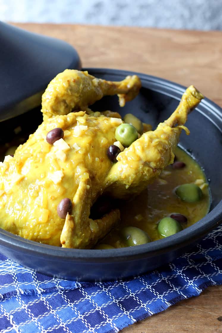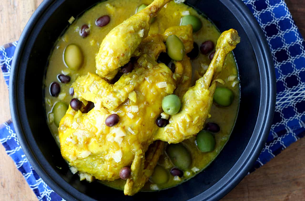6. Leg de kip weer terug in de saus en laat nog een paar minuten pruttelen. Serveer op een schaal of in een tajine en garneer met de olijven en gekonfijte citroen.