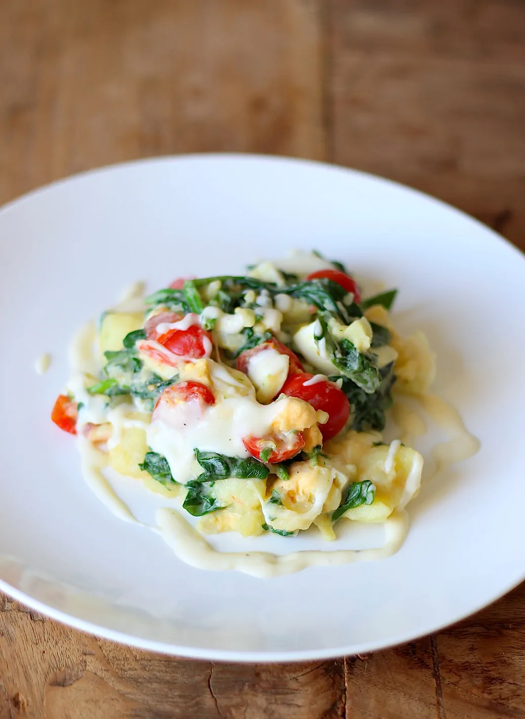 Stamp de aardappels grof met 50ml warme melk en een scheut olijfolie extra vergine. Voeg eventueel extra melk/olijfolie toe als de puree nog te droog is. Schep daarna het spinazie-tomaatmengsel erdoor. Proef, breng eventueel extra op smaak en serveer direct. De kaassaus kun je los op tafel zetten voor de liefhebbers.