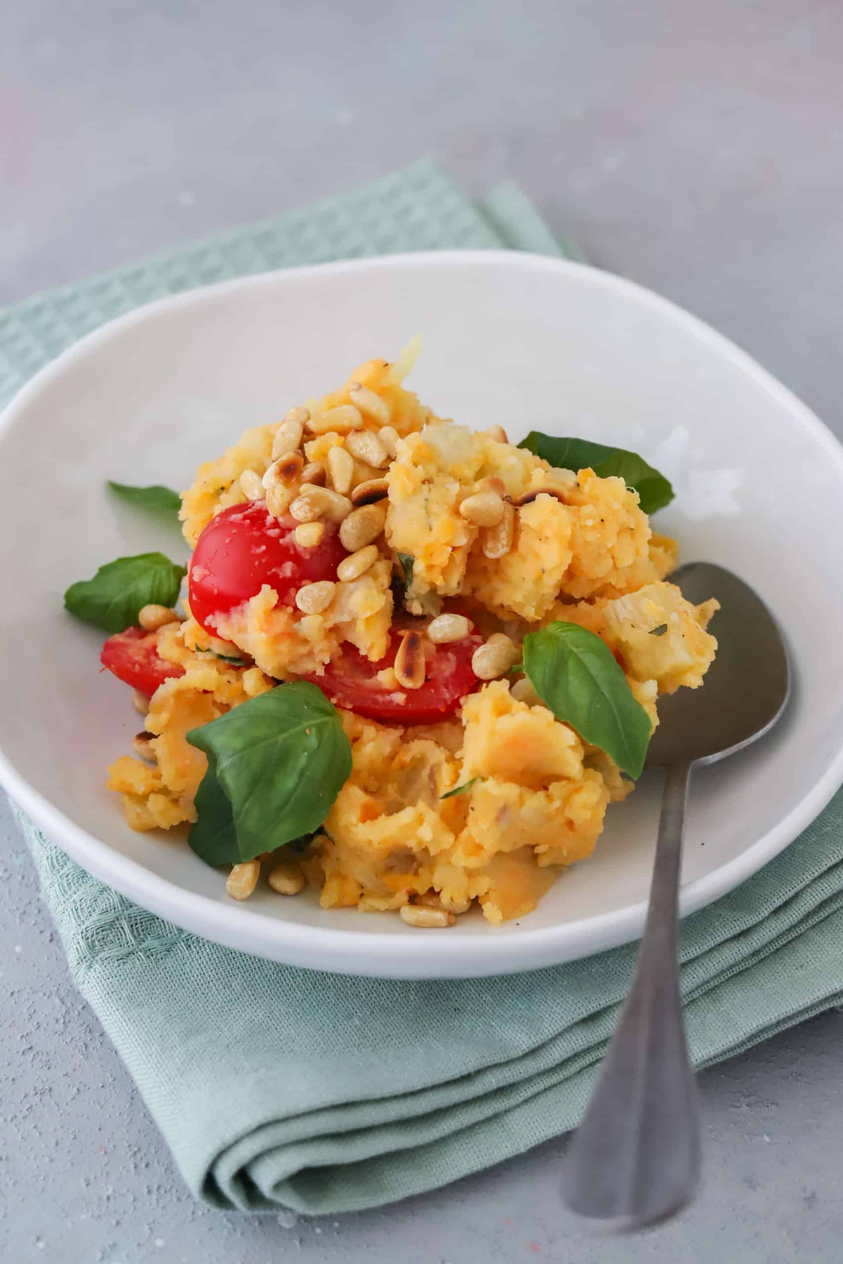 Een heerlijke, vegetarische stamppot met zoete aardappel waar ook kinderen enorm van genieten. Die van mij wel in ieder geval ;-). Nog wat lekkere tips voordat we gaan koken: Voeg in plaats van verse basilicum ook eens wat groene pesto toe aan de stamppot voor een nog rijkere smaak. En hou je van courgette? Roerbak dan wat blokjes in olijfolie en breng op smaak met zout en peper of pesto. Roer deze samen met de mozzarella en cherrytomaten door de stamppot.