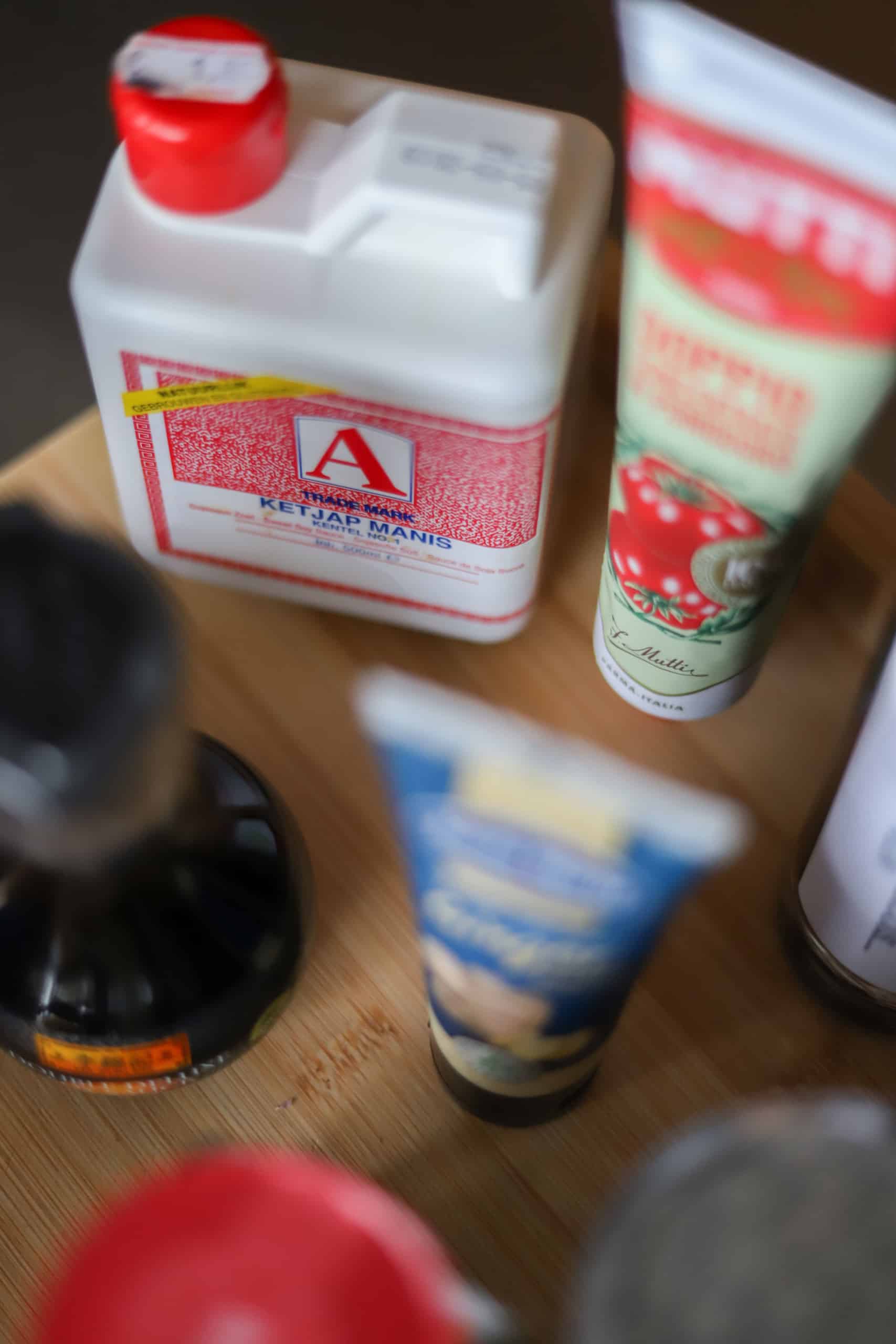 - Overige flesjes met smaakmakers: sojasaus (de beste is van Tomasu, maar die bewaar ik voor speciale gelegenheden vanwege de prijs, voor dagelijks gebruik Kikkoman en om mee te koken gebruik ik ‘Best Soy Sauce’ van Mee Chun), gewone azijn om mee te koken (natuurazijn, witte- en rodewijnazijn en rijstazijn) en zoete ketjap (A-brand)
