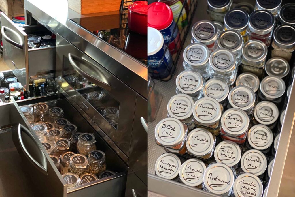De laatste plek van mijn keuken, of eigenlijk het verlengstuk van mijn keuken is natuurlijk mijn voorraadkast. Die vaak uitpuilt, maar ik ruim ‘m ook regelmatig op. Meestal zet ik dan de producten met een kortere houdbaarheidsdatum vooraan zodat ik die eerder opmaak. Een aantal producten heb ik altijd standaard in huis: