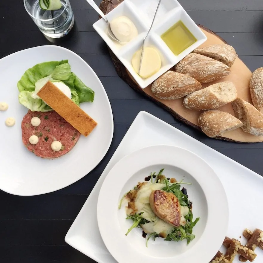 Als voorgerecht hebben we de steak tartare en eendenlever met peer, balsamicostroop en notenbrood besteld. De steak tartare is klassiek en goed bereid. Mijn eendenlever is goed gebakken en combineert (uiteraard) goed met de peer en zoete stroop. Er ligt alleen teveel rucola op mijn bord, dat is zonde. Het vers afgebakken brood en het notenbrood smaakt lekker, fijn begin van het diner.