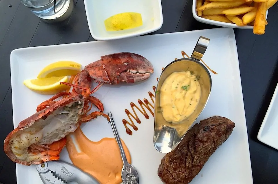 Van de hoofdgerechten word ik direct blij. Hele kreeft, steak frites, zalm, surf & turf, entrecote de Paris en een royale hamburger prijken op de kaart. Voor hele mooie prijzen trouwens! Een hele kreeft voor € 25,- is echt heel netjes en de hamburger bestel je al voor € 13,50. Dat maakt La Cage toegankelijk voor iedereen. Je kunt alleen een burger met een biertje bestellen of je dineert uitgebreider en kiest bijvoorbeeld voor een 3-gangenmenu voor € 32,50 waarbij je 3 gerechten van de kaart bestelt.