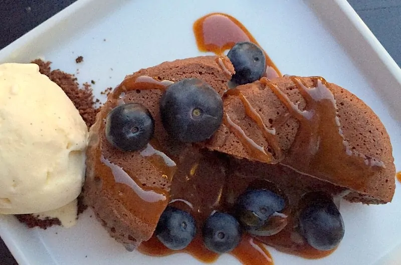 Als dessert nemen we de gemarineerde aardbeien en een goddelijke choco fondant met karamelsaus. Een heerlijk einde van een fijne avond.