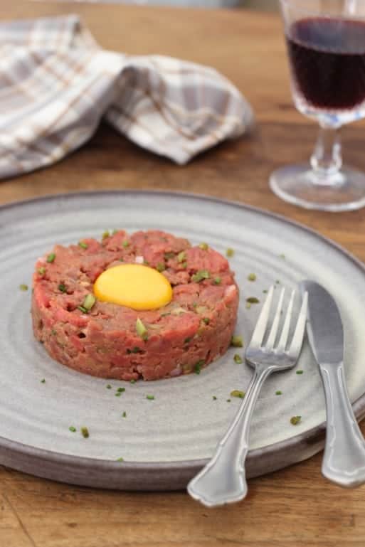 Gebruik een uitsteekring om het bord op te maken. Druk het vlees een beetje aan en laat bovenop in het midden een klein kuiltje. Hier plaats je het eigeel.