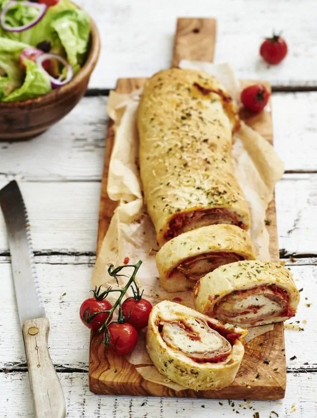 Voor de totale bereiding ben je ongeveer 25 minuten bezig. Het deeg heeft ongeveer 60 minuten nodig om te rijzen en de stromboli gaat ongeveer 25 minuten in de oven.