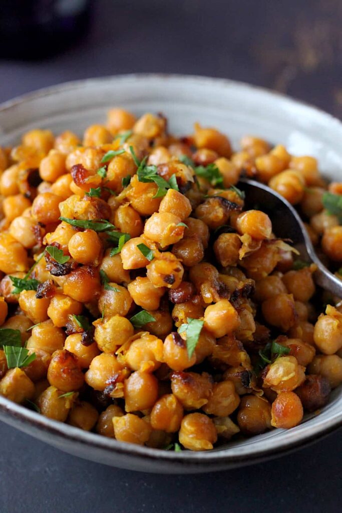 - Voeg de kikkererwten toe samen met de masala en tomatenpuree en roer goed door. Bak circa 15 minuten op middelhoog vuur terwijl je geregeld roert.