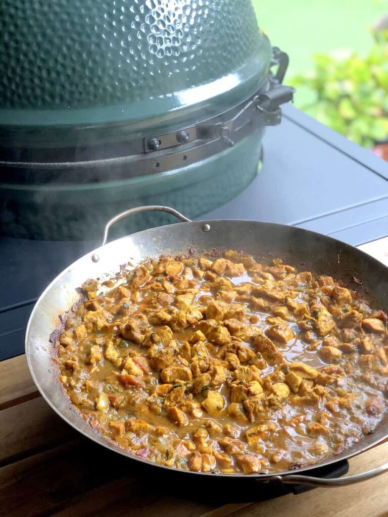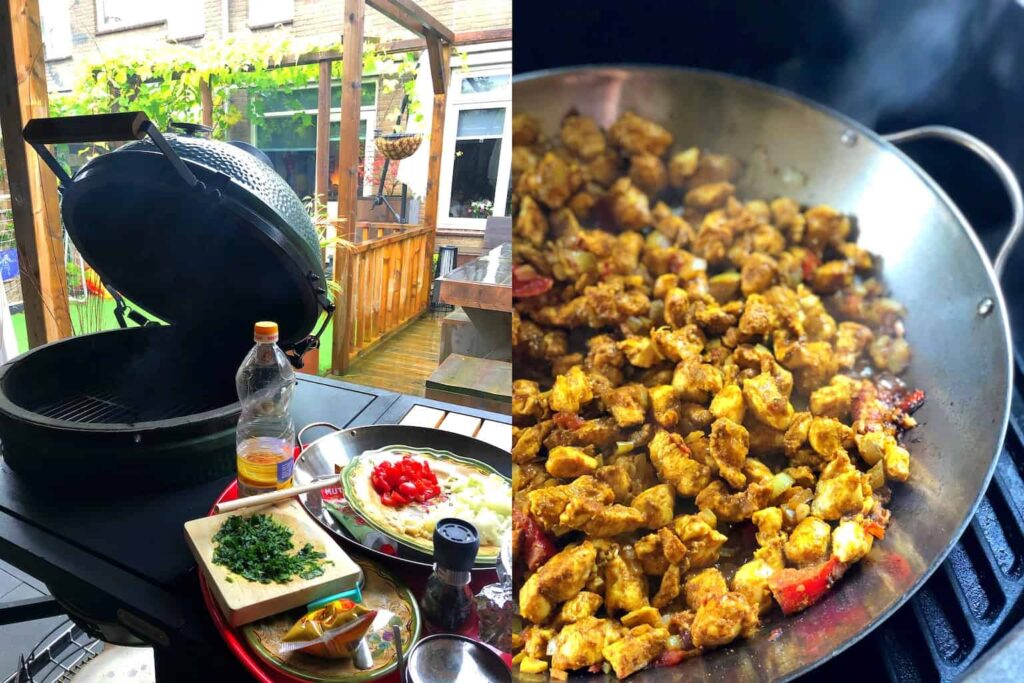 De tijd dat ik dacht dat barbecueën alleen iets was voor het zonnige voorjaar of de zomer is voor altijd voorbij. Sinds wij een buitenkeuken hebben met een kamado barbecue, wandel ik namelijk geregeld naar buiten om ook in de herfst en straks in de winter iets lekkers te koken. Zoals ik laatst nog deed toen het zelfs regende buiten. Met een jas aan en een kopje koffie erbij ging ik onze heerlijke Surinaamse kip kerrie van de barbecue maken.