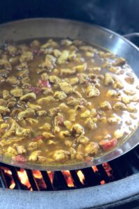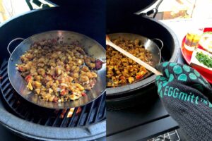 - Vul de je barbecue met houtskool en strooi er een hand hickory houtsnippers over. Verwarm daarna tot 180 °C. Plaats het rooster en zet daarop een grote gietijzeren skillet of, zoals in mijn geval, deze wokpan. Dit vind ik echt een ideale pan om te gebruiken voor dit soort gerechten. Sluit het deksel en zorg dat de pan goed verhit wordt.