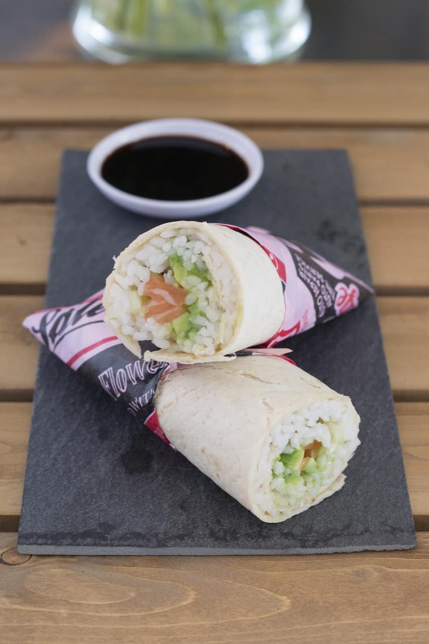 Afgelopen weekend stuurde de Mr mij een linkje door over de sushi burrito. En vaak als hij me iets doorstuurt dan is het een stille hint. In dit geval waren het grote sushi rolls die verpakt waren als burrito. Ik besloot er een echte burrito van te maken. Oftewel, een tortilla belegd met alle ingredienten die je normaal gebruikt om sushi te maken. Maar dan op een tortilla, opgevouwen en in een leuk papiertje verpakt. En opeens heb je dan een sushi burrito. Ik vond het geniaal. Gisteren ben ik gelijk aan de slag gegaan en vriendinnetje Wendy maakte er een paar geweldige foto’s van. Vandaag dus een recept waar ik weinig voor heb hoeven te doen, alleen bereiden en opeten. Ook weleens lekker. Zometeen maak ik er trouwens nog 2, om mee te nemen als lunch vandaag. Dat is misschien nog wel genialer.