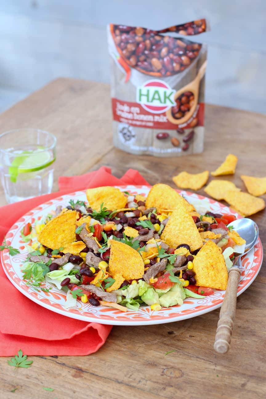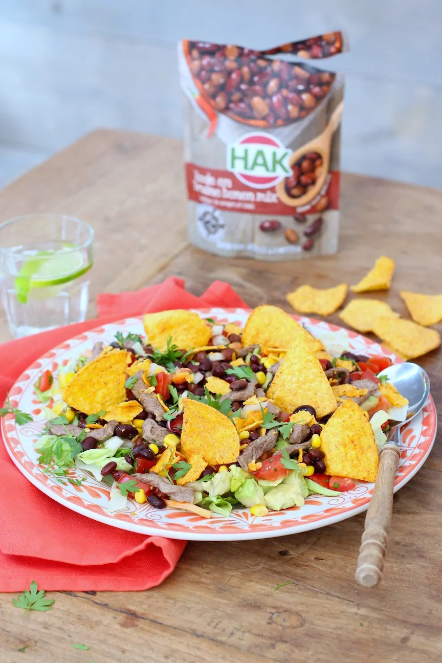 Tegenwoordig kun je tal van bonenmixen vinden in de supermarktschappen. Zowel in pot als stazak en die zijn naast heel gezond ook makkelijk in gebruik. Zo maakte ik met een rode en bruine bonenmix deze heerlijke tacosalade met bruine bonen en biefreepjes. Een maaltijdsalade die je zowel voor de lunch als het avondeten kunt maken. Ook heel geschikt voor kinderen trouwens! Eet je ‘m liever met kip, geen probleem. Ga dan voor kipfilet of kippendijen. En vegetarisch kan natuurlijk ook, laat dan de runderreepjes eruit of kies voor vegetarische kipstukjes. Eet smakelijk!