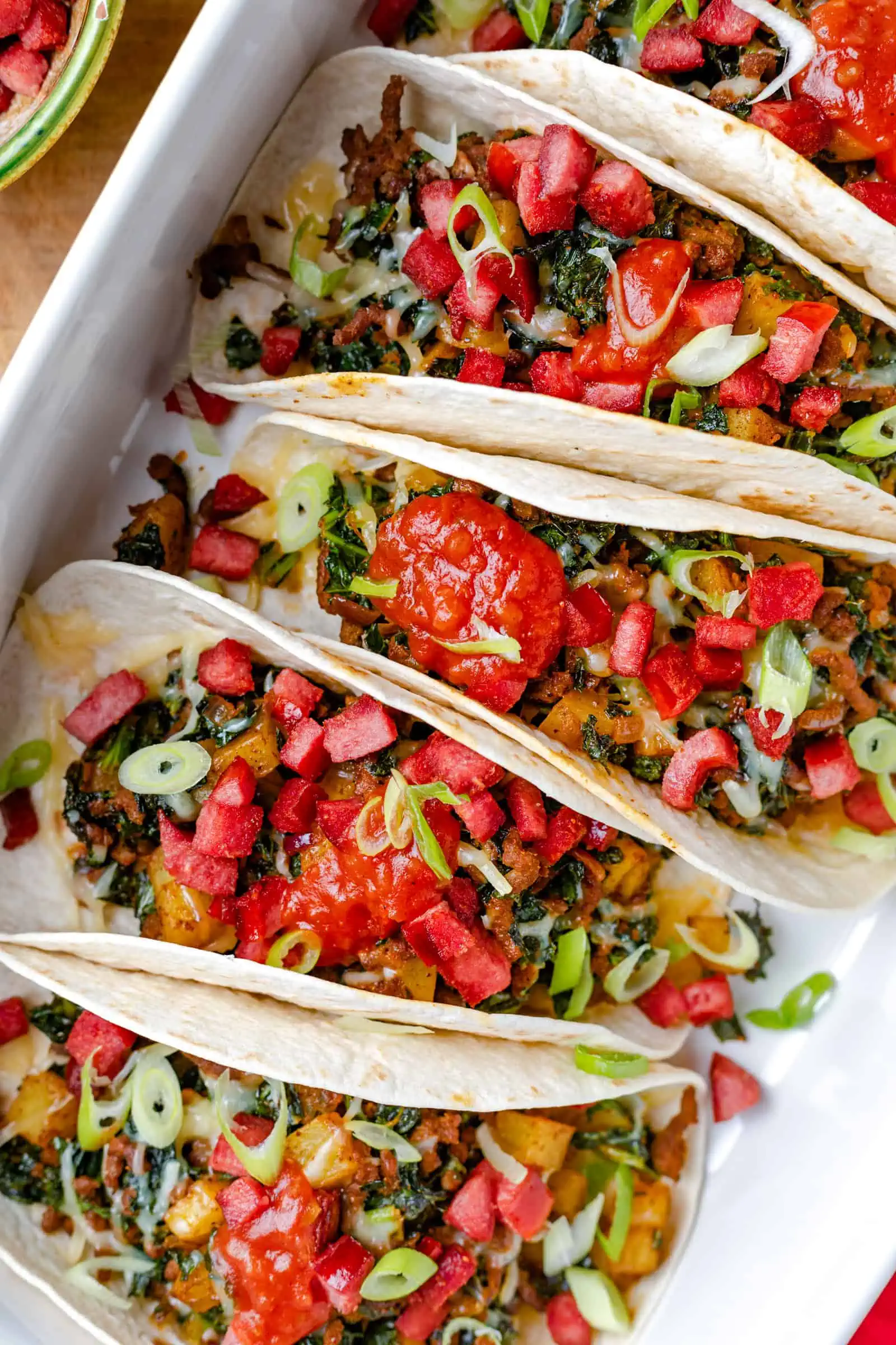 - Haal daarna uit de oven en garneer de boerenkool taco’s met extra blokjes rookworst, een lepeltjes tacosaus en ringetjes lente-ui. Serveer direct en zet ook het potje tacosaus en overgebleven oude kaas op tafel.