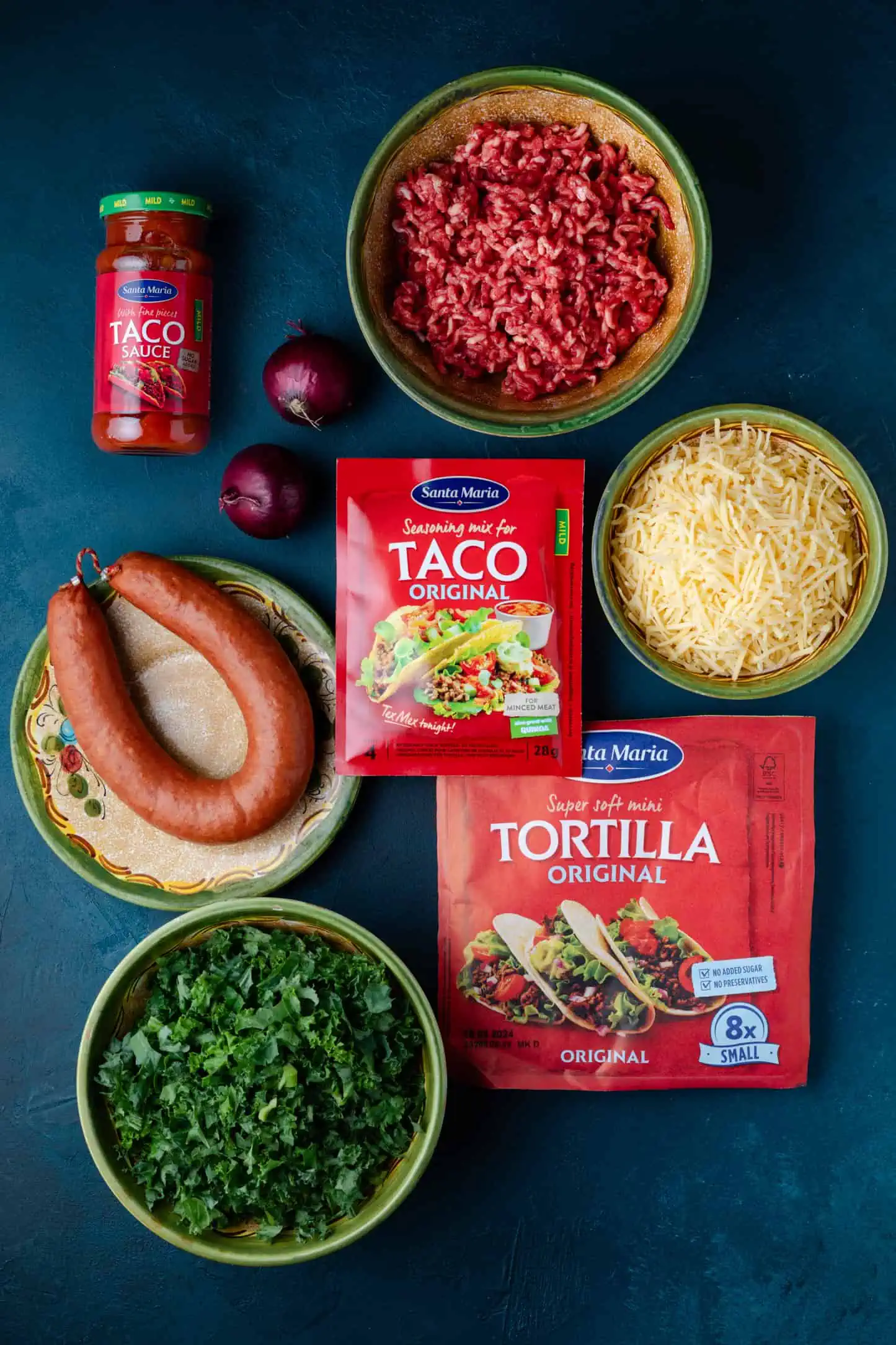 Ik gebruikte hiervoor als basis de klassiekers uit het Santa Maria assortiment, zoals de Taco Seasoning Mix en de Mini Tortilla’s die ik ideaal vind voor het maken van taco’s. Ik warm ze altijd kort op in een koekenpan zonder vet. Even om en om in een hete pan en daarna vouw ik ze dubbel en zet ze in een tacohouder of in een ovenschaal zoals deze om ze te vullen.
