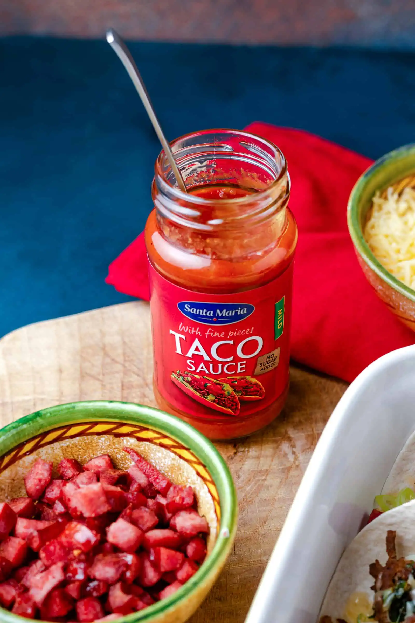 Een potje met Taco Sauce plaatste ik op tafel voor de finishing touch. En als je daar nou wat van over houdt, dan kun je het potje (goed afgedekt) echt nog weken bewaren in de koelkast.