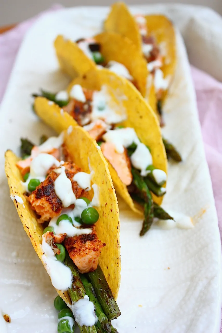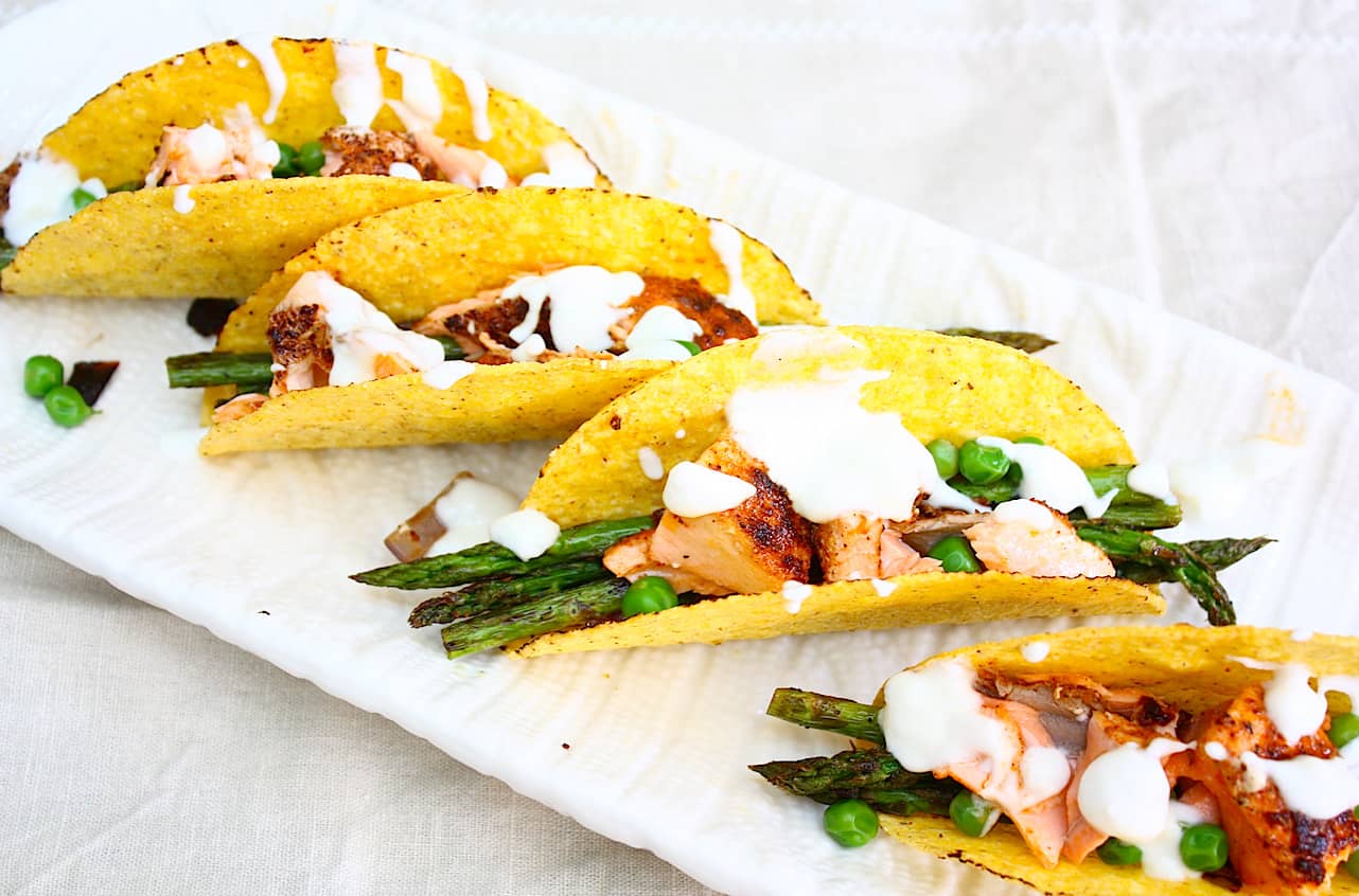 Vul de taco shells met de asperges, doperwten, rode ui, zalm en sprenkel de saus eroverheen. Met deze taco’s met zalm kan het Tex Mex feestje beginnen!Â