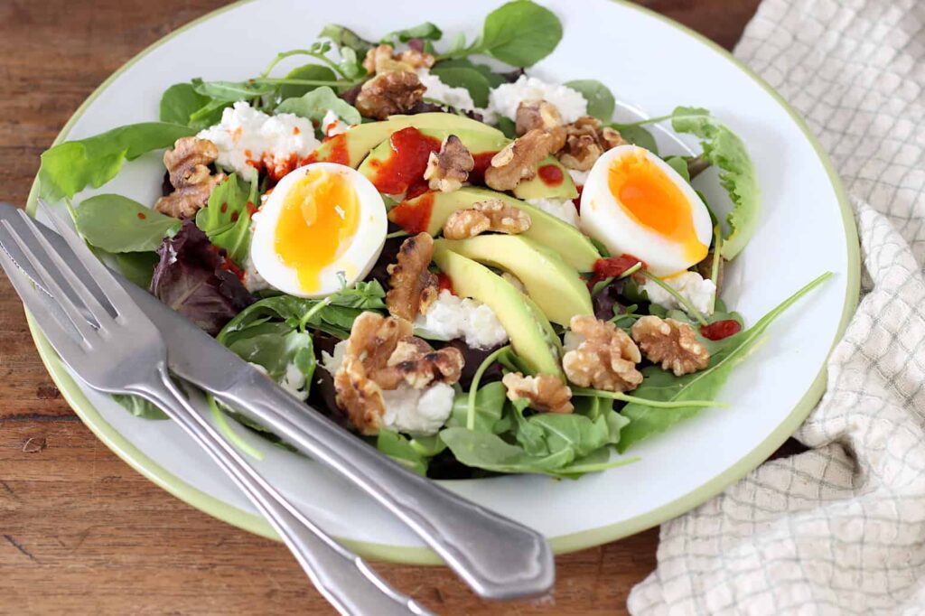 Salade met avocado, ei en sriracha